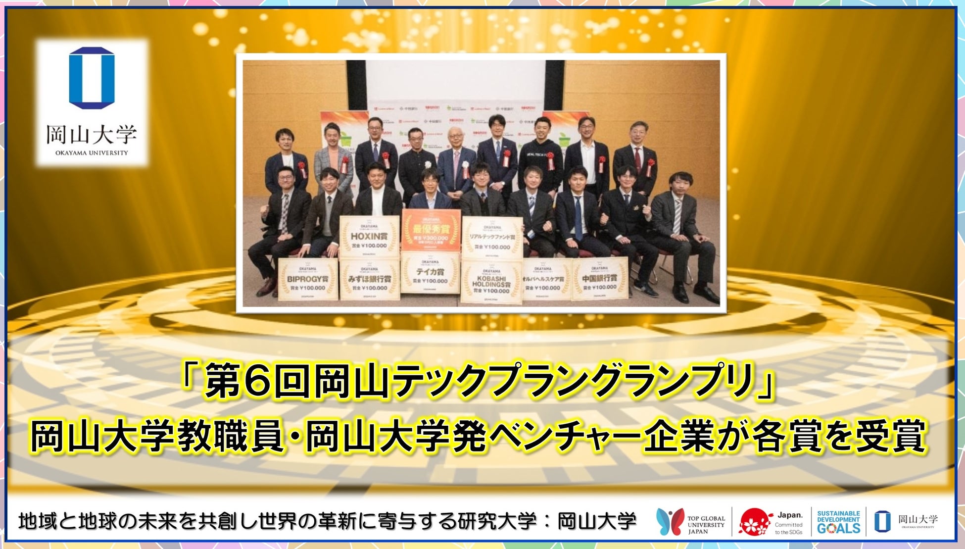 岡山発ベンチャーの発掘と育成を目的としたビジネスプランコンテスト「第6回岡山テックプラングランプリ」(主催:株式会社中国銀行・株式会社リバネス・KOBASHI HOLDINGS株式会社)が2024年2月5日に開催され、本学教職員・岡山大学発ベンチャー企業が優秀賞にあたる「企業賞」の各賞を受賞しました。