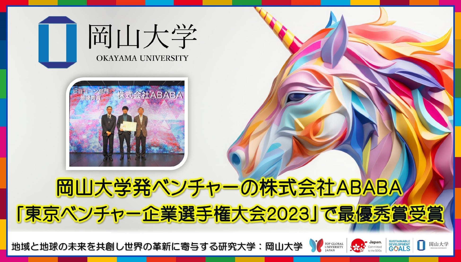 2024年1月22日に開催された「東京ベンチャー企業選手権大会2023」ファイナルイベントにおいて、岡山大学発ベンチャー称号授与企業である株式会社ABABAがヒヨコーン部門最優秀賞(東京都知事賞)を受賞しました。