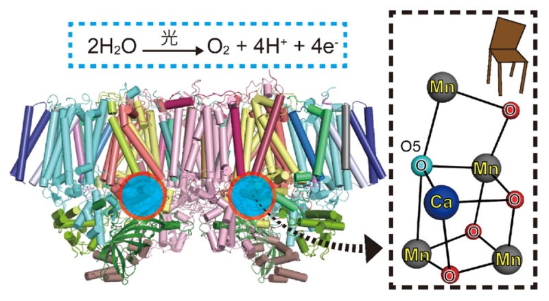 全20個のタンパク質からなる複合体が2つ集合して1つの構造をとり、水分子から水素イオン(H+)と電子(e-)を取り出して酸素分子を形成する反応を触媒する。赤丸で囲んだ部分に反応を進行させる触媒があり、これは右側に拡大するようにゆがんだイス型のマンガンクラスターである