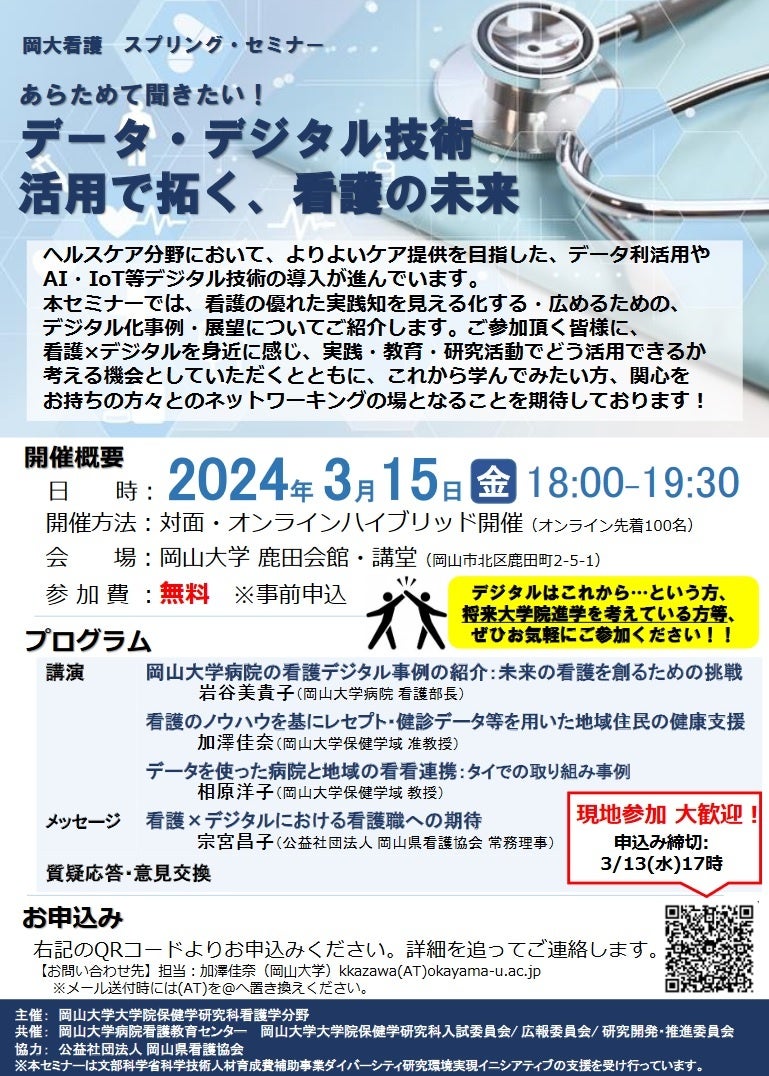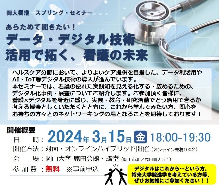 国立大学法人岡山大学(本部:岡山市北区、学長:那須保友)の大学院保健学研究科看護学分野では、2024年3月15日(金)18:00~19:30に、岡大看護スプリング・セミナー 「あらためて聞きたい! データ・デジタル技術活用で拓く、看護の未来」にハイブリッド形式で開催します。