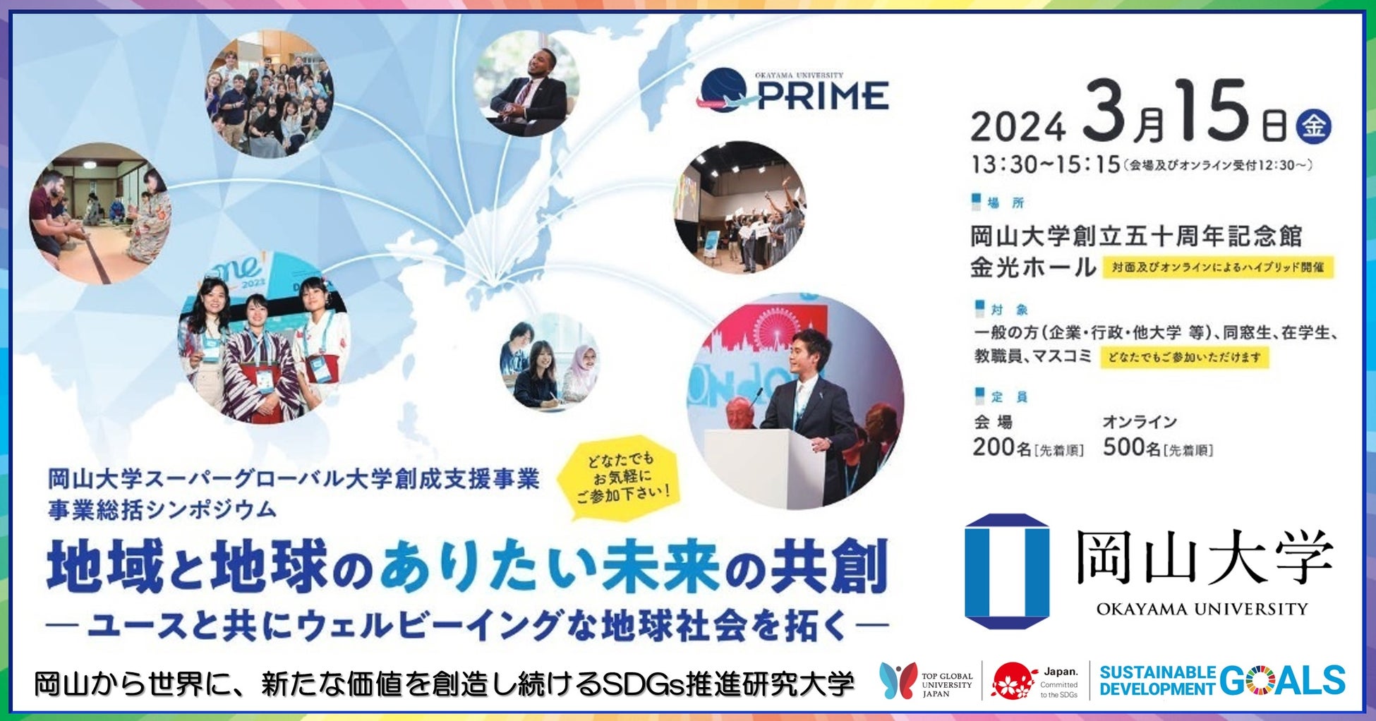 当該事業が今年度で最終年度を迎えることを受けて、この度、本学関係者、グローバルな環境で学ぶ学生、外部有識者等を交え、本事業の成果を幅広く展開し、今後の課題を考えるシンポジウム「岡山大学スーパーグローバル大学創成支援事業事業総括シンポジウム 地域と地球のありたい未来の共創-ユースと共にウェルビーイングな地球社会を拓く-」を、2024年3月15日(金)13:30~15:15にハイブリッド形式で開催します。