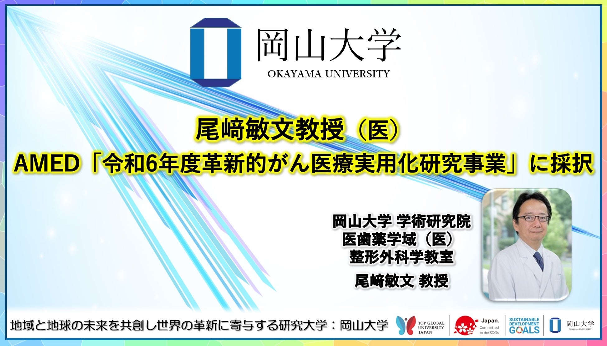 国立大学法人岡山大学(本部:岡山市北区、学長:那須保友)学術研究院医歯薬学域(医学系)整形外科学教室の尾﨑敏文教授が、国立研究開発法人日本医療研究開発機構(AMED)の「令和6年度革新的がん医療実用化研究事業」(一次公募)に採択され、2024年3月22日にAMEDホームページに公開されました。