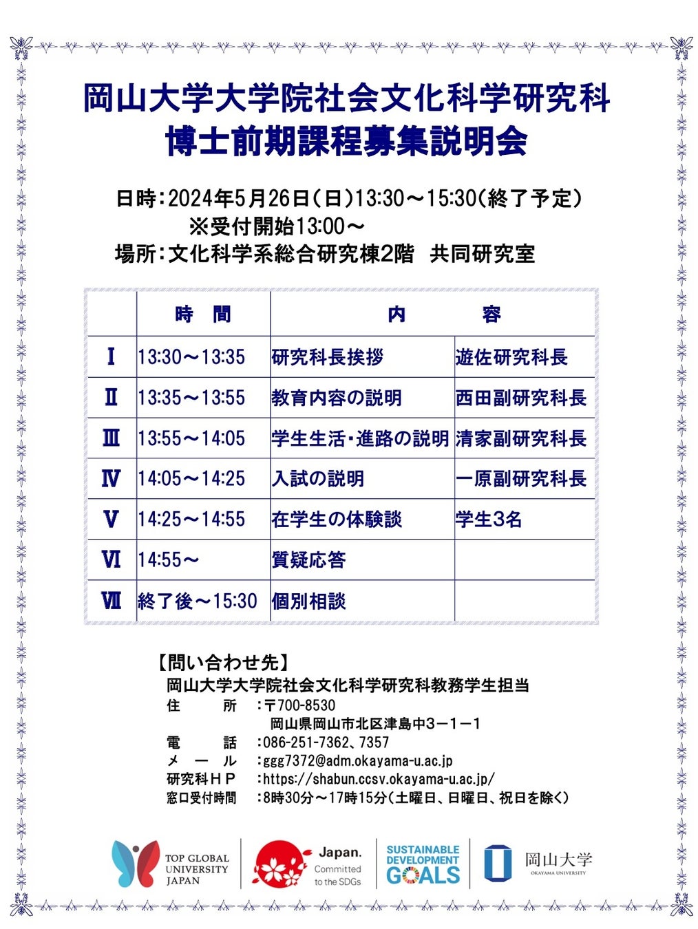 国立大学法人岡山大学(本部:岡山市北区、学長:那須保友)の大学院社会文化科学研究科(博士前期課程)は、今後大学院への進学を目指す方・受験を考えている方に本研究科の教育内容や入試の説明等を広く周知することを目的として、2024年5月26日(日)に本学津島キャンパスの文化科学系総合研究棟2階共同研究室で「募集説明会」を開催します。