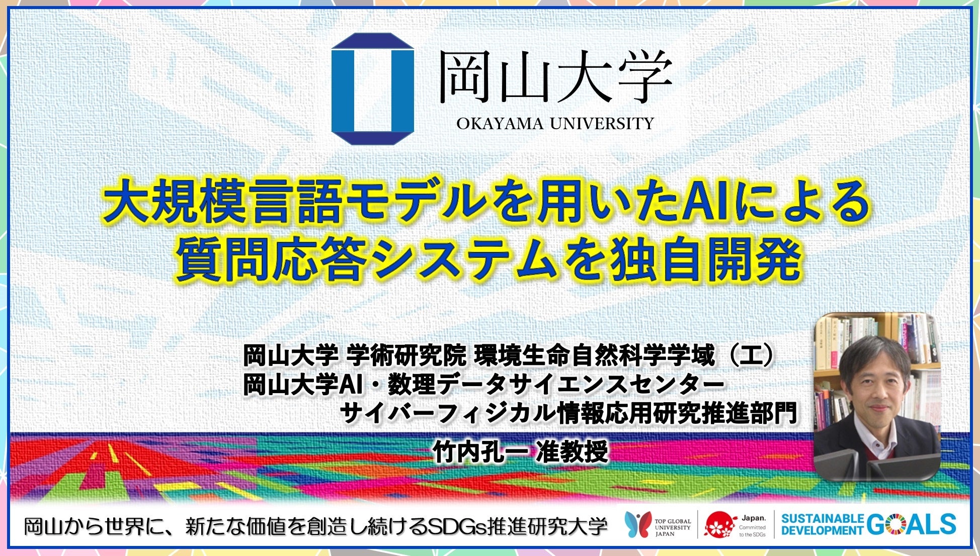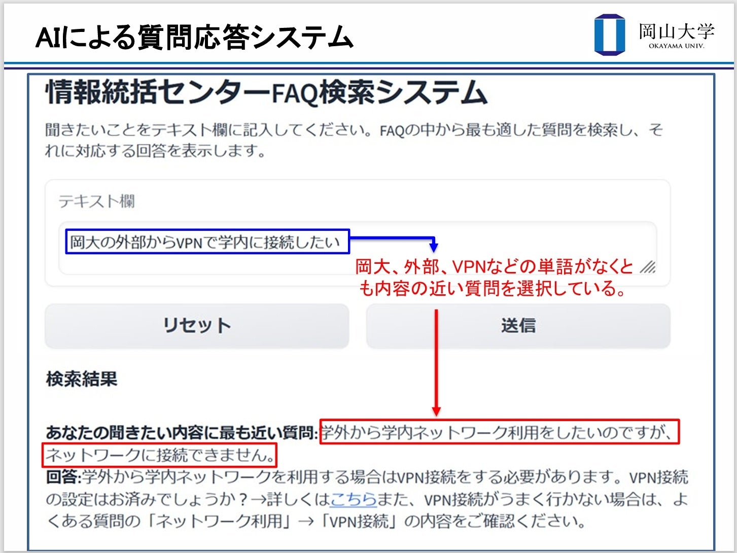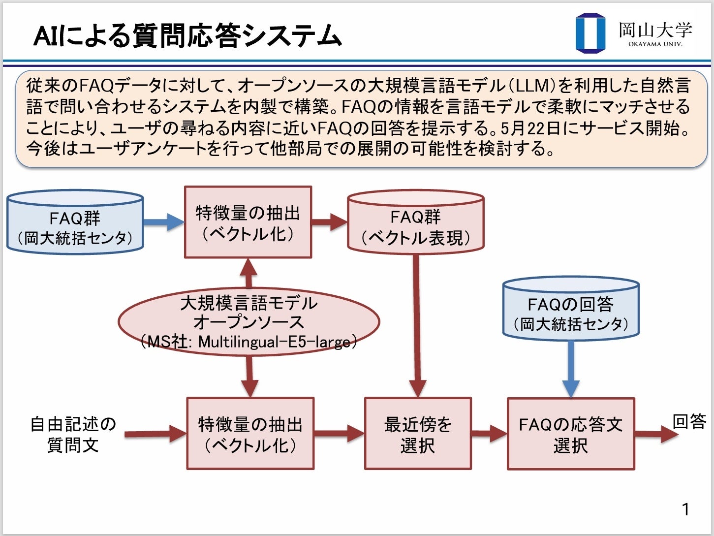 第一弾として2024年5月22日から、岡山大学情報統括センターの「よくある質問(FAQ)」でサービスを開始しました。生成AIの課題として誤った文を生成してしまう欠点があるため、LLMをFAQの検索に適用することで、この欠点を回避しています。