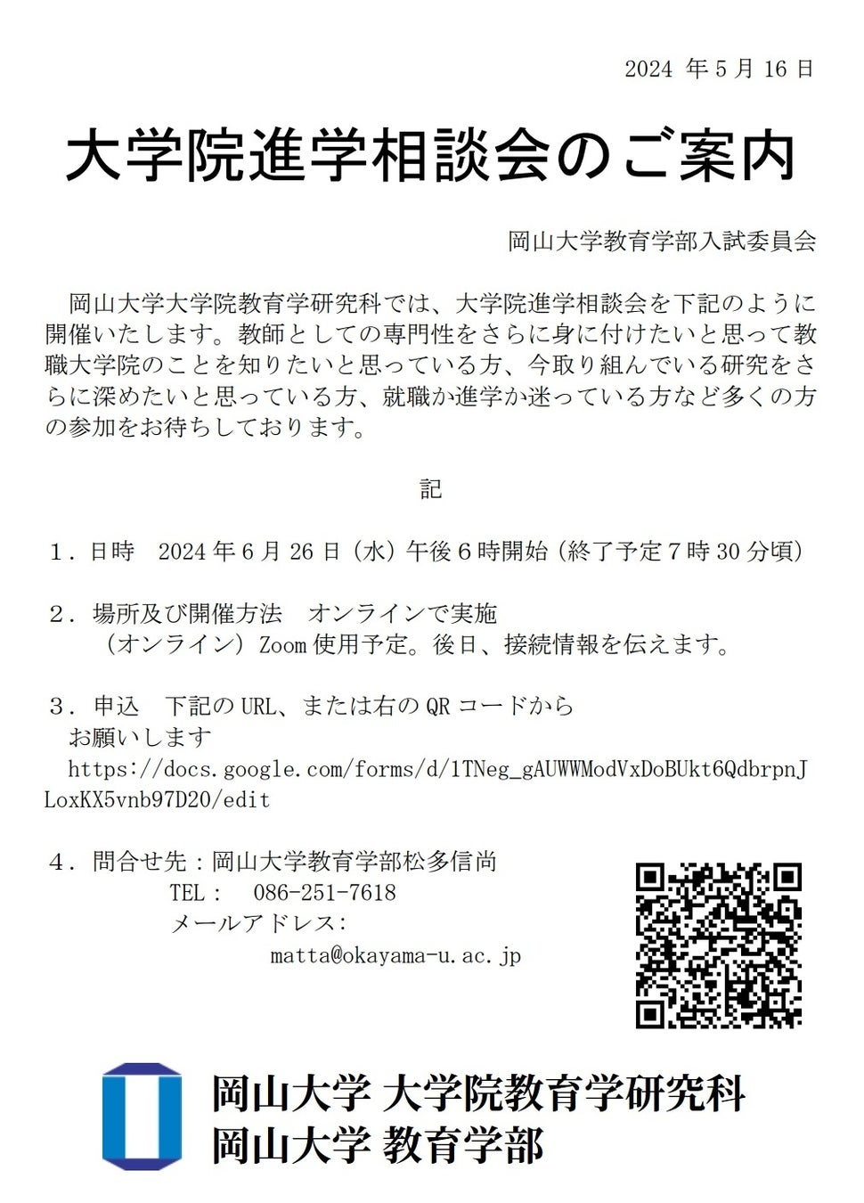国立大学法人岡山大学(本部:岡山市北区、学長:那須保友)の大学院教育学研究科では、2024年6月26日(水)18:00~にzoomによるオンラインで大学院進学相談会を開催いたします。
