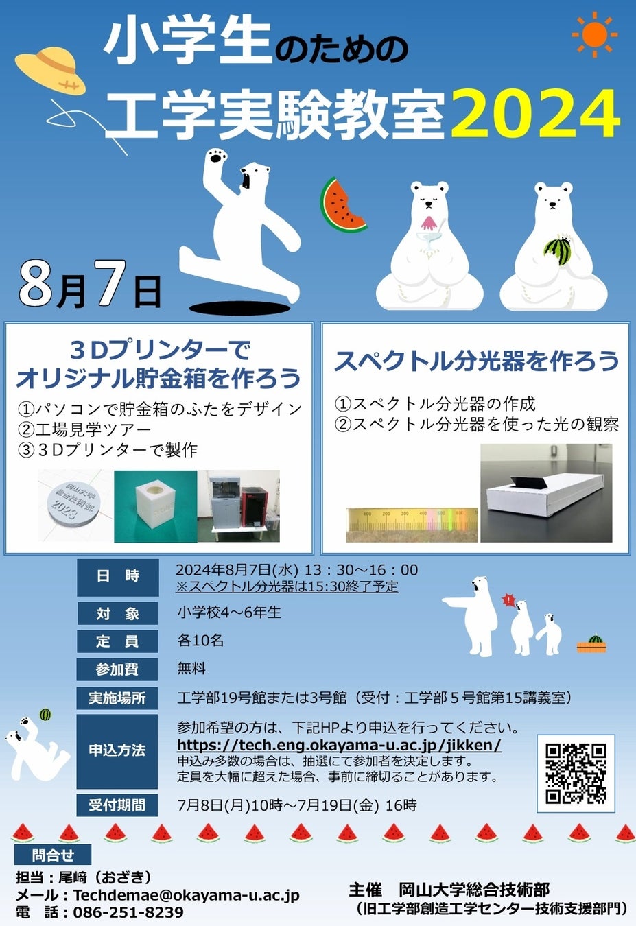 国立大学法人岡山大学(本部:岡山市北区、学長:那須保友)の技術統括監理本部のひとつである総合技術部は、2024年8月7日(水)に本学津島キャンパスの工学部で「小学生のための工学実験教室 2024」を開催します。