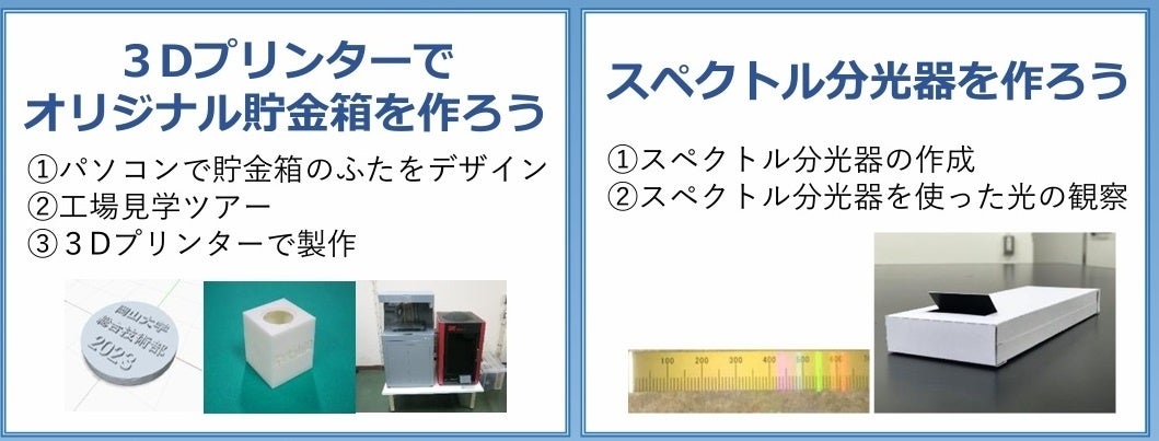 今回は小学校4、5、6年生を対象に「3Dプリンターでオリジナル貯金箱を作ろう」、「スペクトル分光器を作ろう」を開催します。