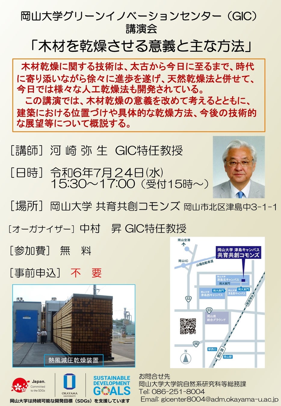 国立大学法人岡山大学(本部:岡山市北区、学長:那須保友)の岡山大学グリーンイノベーションセンターでは、2024年7月24日(水)15:30~17:00に講演会「木材を乾燥させる意義と主な方法」を本学津島キャンパスにある共育共創コモンズで開催します。