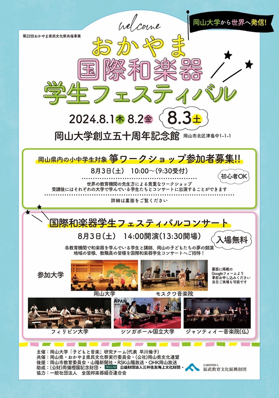 国立大学法人岡山大学(本部:岡山市北区、学長:那須保友)では、2024年8月1日(木)から3日間に渡り、世界で和楽器を学ぶ学生と指導者を岡山大学へ招聘し、岡山大学の学生及び岡山県の子どもとたちと和楽器(箏)を通して国際交流を本学津島キャンパスの創立五十周年記念館で行います。