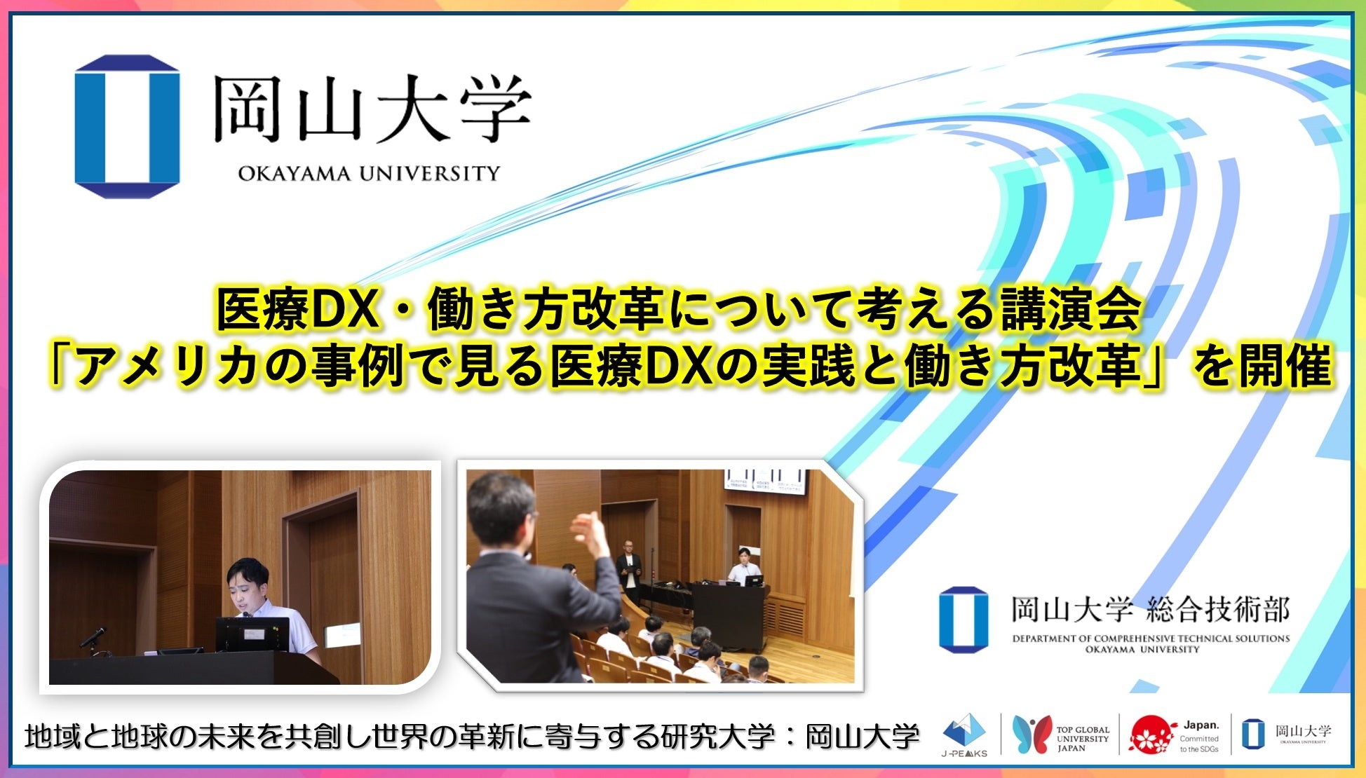 国立大学法人岡山大学(本部:岡山市北区、学長:那須保友)技術統括監理本部を構成する組織のひとつである総合技術部は2024年6月13日、医療DXを目的とする講演会「アメリカの事例で見る医療DXの実践と働き方改革」を本学鹿田キャンパスの鹿田会館講堂で開催しました。