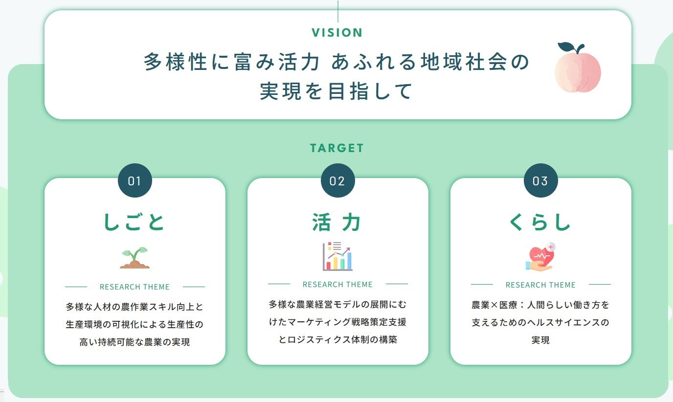 同拠点は、本学の農・工・経済・医学分野の研究者の専門知識の活用、岡山県・農業団体の農業政策・技術専門家および岡山県内外の民間企業との連携体制を構築していることから、「総合知活用の実践を行う事例」として選定されました。