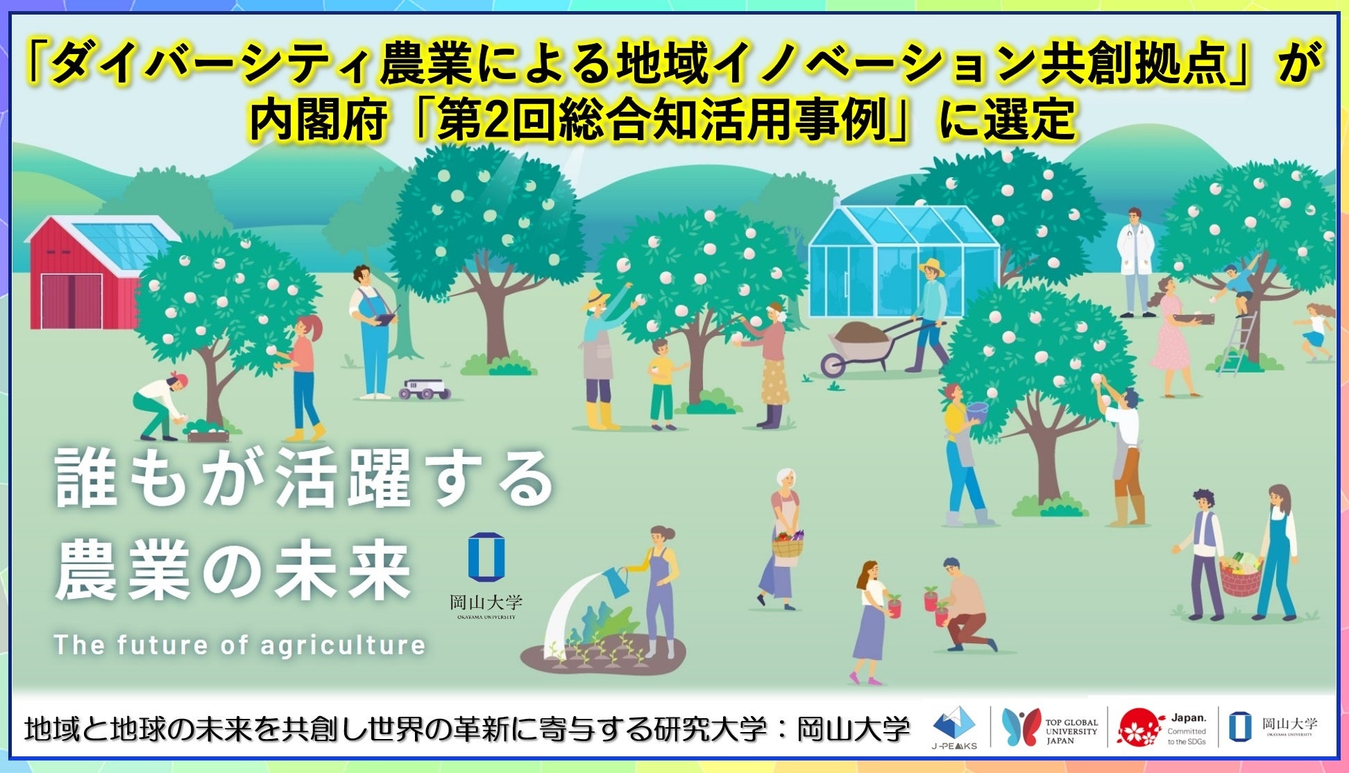 国立大学法人岡山大学(本部:岡山市北区、学長:那須保友)が代表機関を務める「ダイバーシティ農業による地域イノベーション共創拠点」(プロジェクトリーダー:林靖彦副理事(共創の場)・学術研究院環境生命自然科学学域教授)が内閣府「第2回総合知活用事例」に選定され、2024年7月24日に内閣府ホームページで紹介されました。