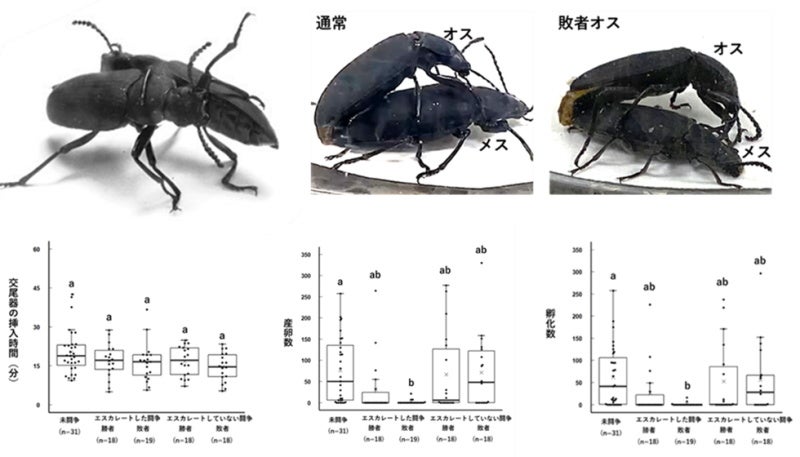 図. ツヤケシオオゴミムシダマシに見られた互いに脚を嚙み合うオス同士の闘争(左上)と、闘争していないオスの交尾(中央上)と、負けたオスが上手く脚を突っ張れずに交尾に不具合の見られる様子(右上)。グラフはオス同士の対戦の勝敗と、その後の繁殖形質の関係を示す。