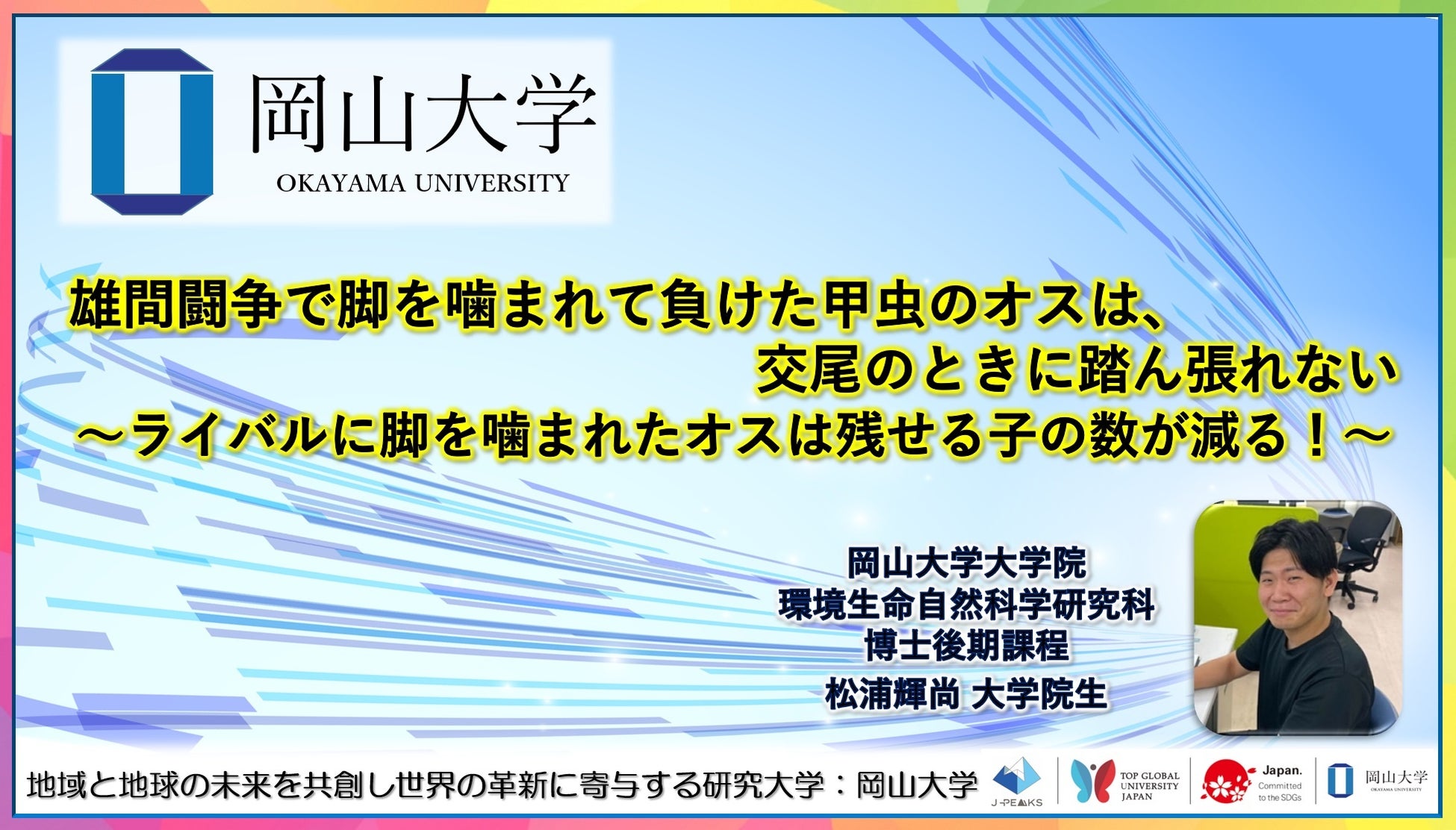 国立大学法人岡山大学(本部:岡山市北区、学長:那須保友)の大学院環境生命自然科学研究科博士後期課程2年の松浦輝尚大学院生と岡山大学学術研究院環境生命自然科学学域(農)の宮竹貴久教授は、ツヤケシオオゴミムシダマシ(通称:ジャイアントミルワーム)のメスをめぐるオス同士の闘争行動を研究し、オス同士が相手の脚を噛み合うという奇妙な喧嘩を行うことを発見しました。