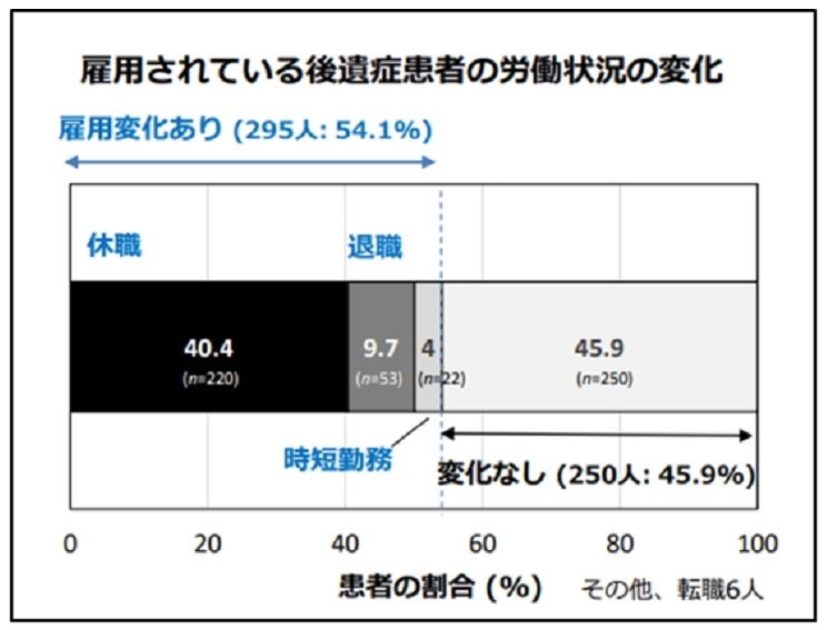 今回の検討では、雇用されている後遺症患者の過半数(54%)に就労状況の変化を認めました。