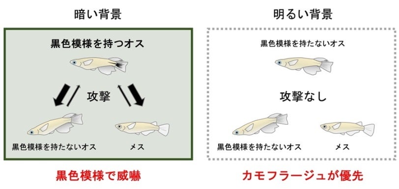 背景が明るい環境下では黒色模様を持つオスが消失し、集団内での攻撃行動も生じないことから、セレベスメダカは環境に応じて黒色模様を威嚇シグナルとして用いることが判明しました。