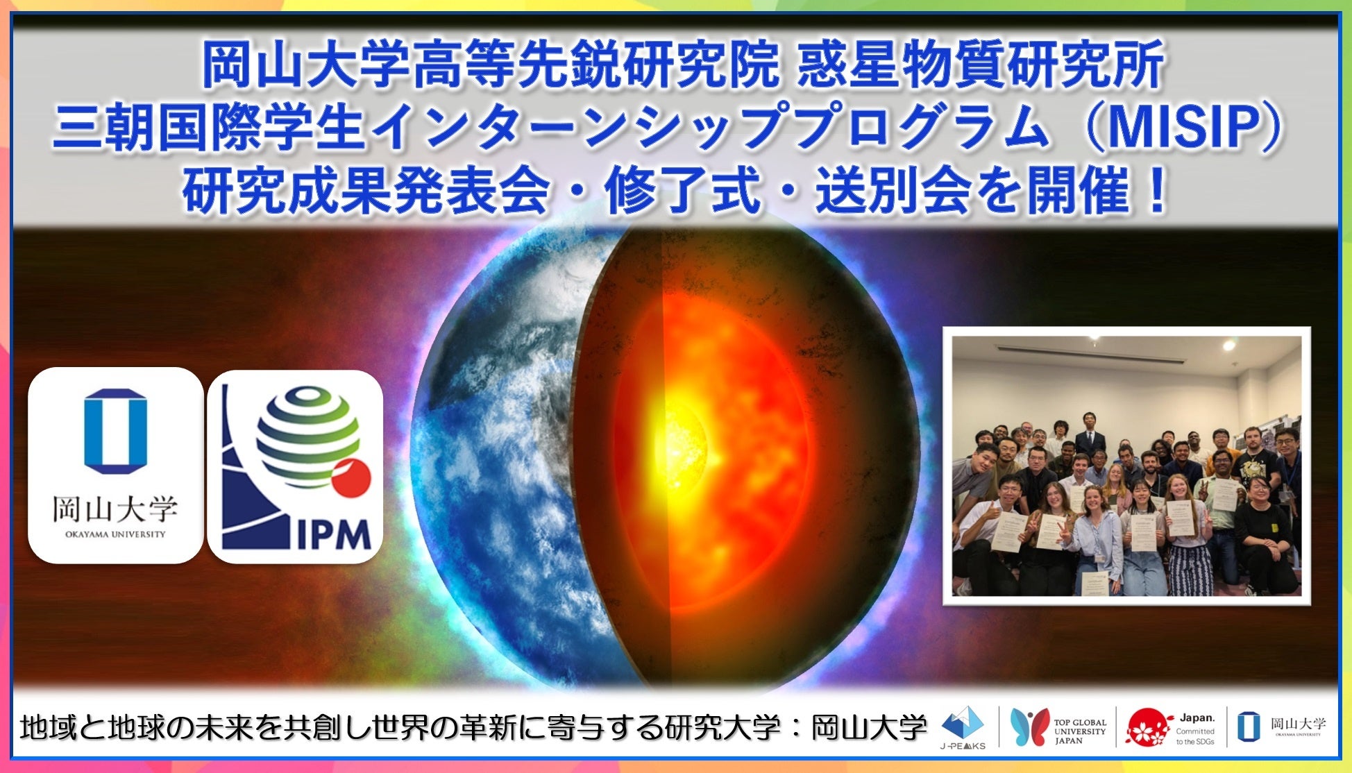 国立大学法人岡山大学(本部:岡山市北区、学長:那須保友)の高等先鋭研究院を構成する組織のひとつである惑星物質研究所(鳥取県三朝町)にて2024年8月8日、「三朝国際学生インターンシッププログラム(MISIP;Misasa International Student Internship Program)」の研究成果発表会、修了式、送別会を開催しました。
