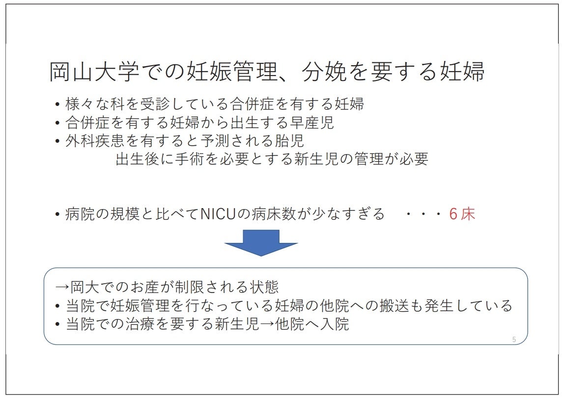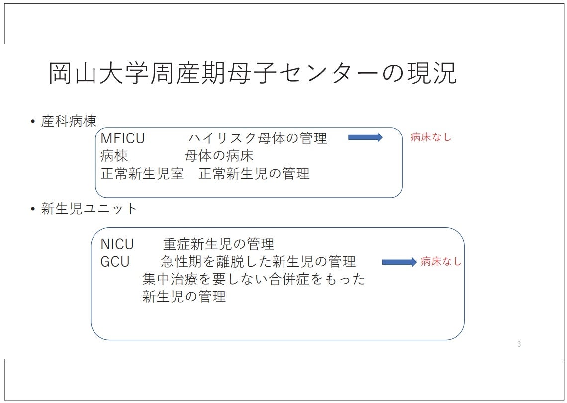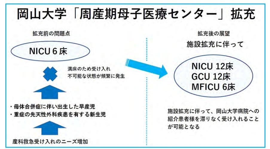 国立大学法人岡山大学(本部:岡山市北区、学長:那須保友)の岡山大学病院はこれまで、地域周産期母子医療センターとして、NICU 6床・新生児室 12床(GCUはなし)で診療してきましたが、NICUが満床になった場合、近隣病院への母体搬送や新生児の受け入れをお願いしていました。