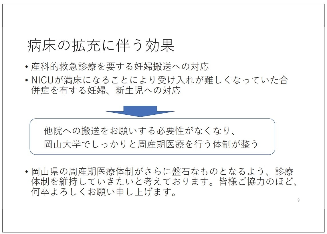 そのため、岡山県や近隣病院との協議を経て、2024年年9月1日より岡山大学病院におけるNICUおよびGCUを拡充することになりましたので、お知らせします。なお、2025年度にはMFICUも設置する予定としています。