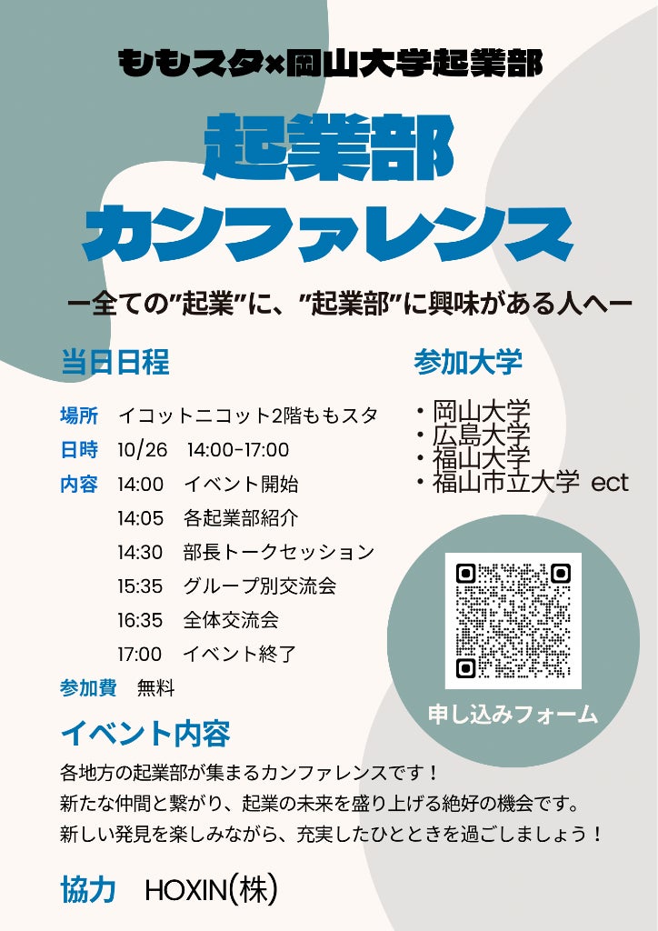 国立大学法人岡山大学(本部:岡山市北区、学長:那須保友)の岡大起業部は、2024年10月26日(土)14:00~17:00に、ももたろうスタートアップカフェにおいて「起業部カンファレンス」を開催します。