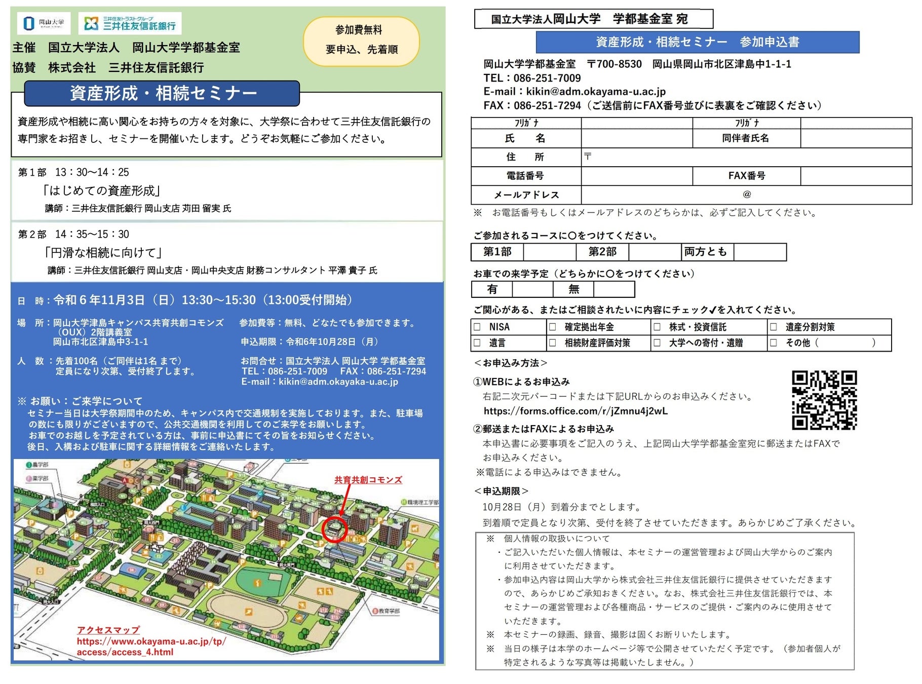 国立大学法人岡山大学(本部:岡山市北区、学長:那須保友)学都基金室では、資産形成や相続に高い関心をお持ちの方々を対象に、大学祭に合わせて三井住友信託銀行の専門家をお招きし、「資産形成・相続セミナー」を本学津島キャンパスの共育共創コモンズ(OUX)で開催いたします。