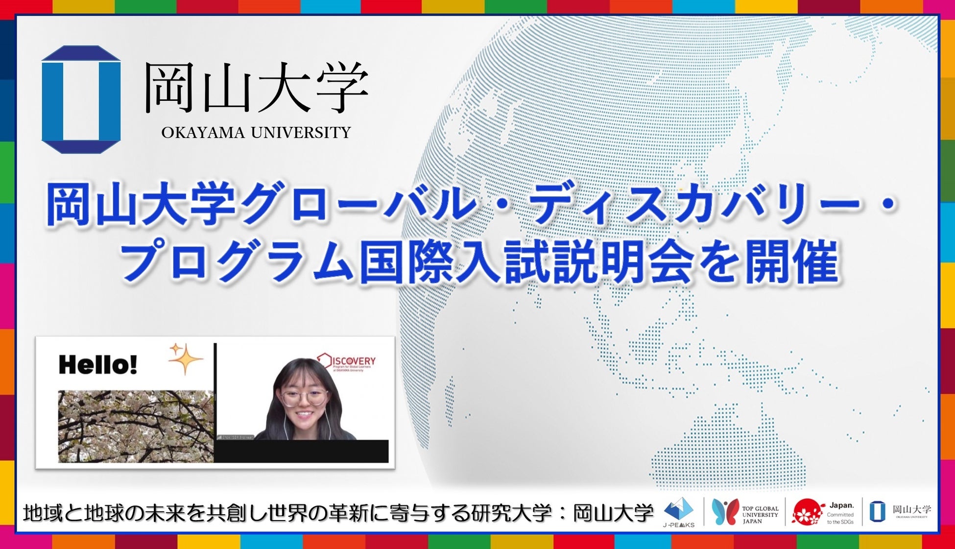 国立大学法人岡山大学(本部:岡山市北区、学長:那須保友)は、2024年9月20日、グローバル・ディスカバリー・プログラムの国際入試説明会をオンラインで開催しました。海外を中心に高校生や保護者の方々など約45人が参加しました。