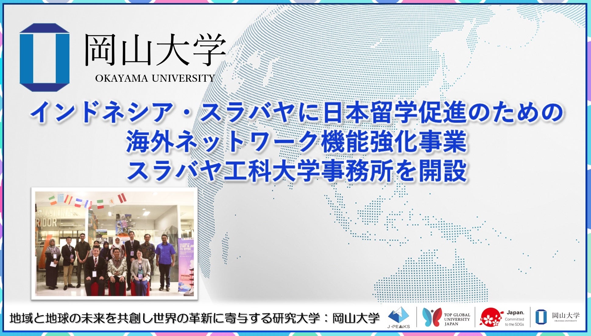 国立大学法人岡山大学(本部:岡山市北区、学長:那須保友)は2024年9月17日、日本留学促進のための海外ネットワーク機能強化事業スラバヤ工科大学事務所を、インドネシアのスラバヤ工科大学(ITS)内に開設し、開所式を行いました。