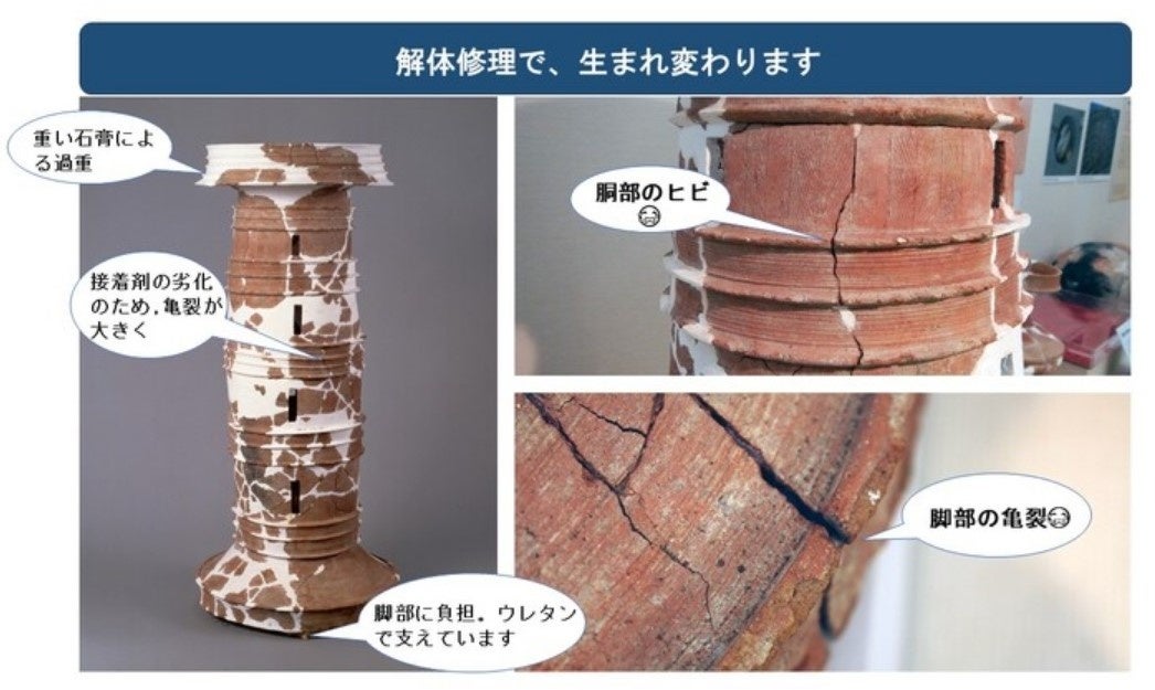 しかし、出土して50年近い年月がたつ中で、接着剤や石膏の劣化が進み、接合箇所の亀裂が大きくなって、脚部が自重に耐えられない状態となってきました。博物館等からの借用を少なくとも10年以上お断りしている状態ですし、学生の研究にも支障をきたしています。