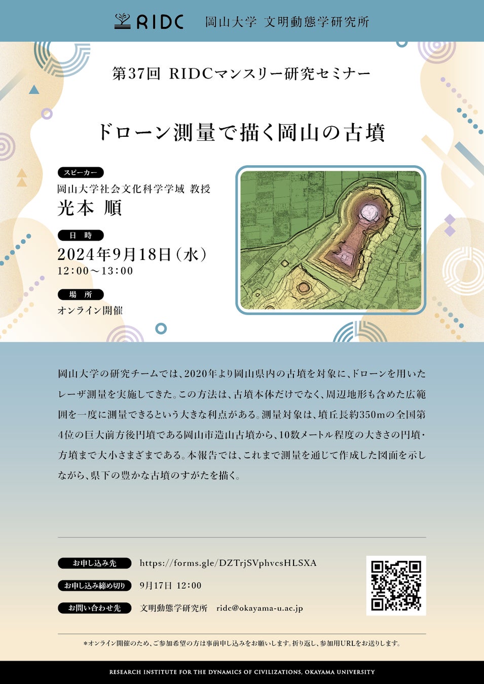 今回、2024年9月18日(水)にオンライン開催した第37回RIDCマンスリー研究セミナー「ドローン測量で描く岡山の古墳」(スピーカー:岡山大学 学術研究院 社会文化科学学域 教授 光本 順 氏)の録画配信を2024年9月19日に開始しました。ぜひ皆様にご視聴頂けますと幸いです。