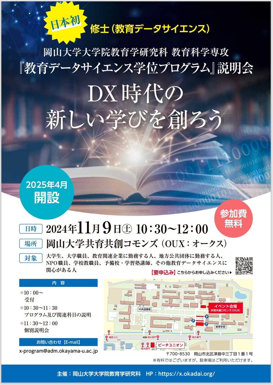今回、本学津島キャンパスの岡山大学共育共創コモンズ(OUX:オークス)において、教育データサイエンス学位プログラムで何を学ぶことができるか、その関連科目と併せて説明します。ぜひこの機会にご興味かる方々のご参加をお待ちしております。