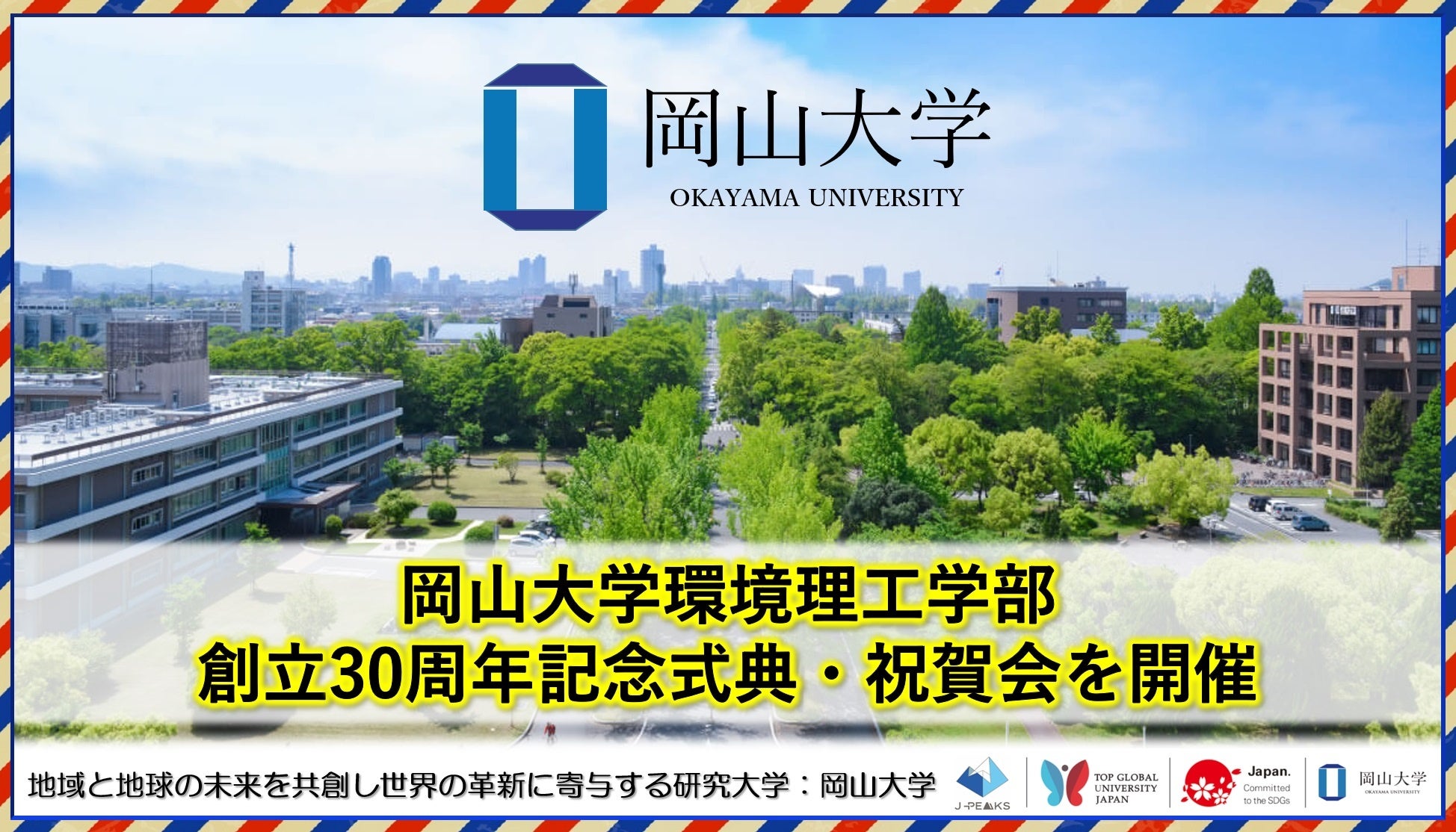 国立大学法人岡山大学(本部:岡山市北区、学長:那須保友)の環境理工学部が創立30周年を迎えたことを記念して、2024年10月19日、工学部環境理工棟(旧環境理工学部棟)および市内ホテルにて記念式典・祝賀会を開催しました。