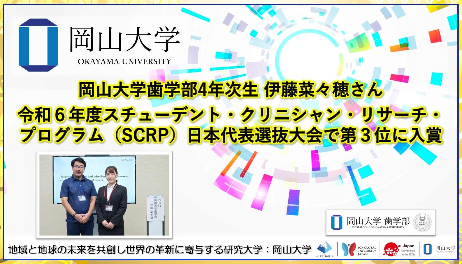 ・【岡山大学】歯学部4年次生 棚井あいりさん「令和3年度スチューデント・クリニシャン・リサーチ・プログラム(SCRP)日本代表選抜大会」優勝!