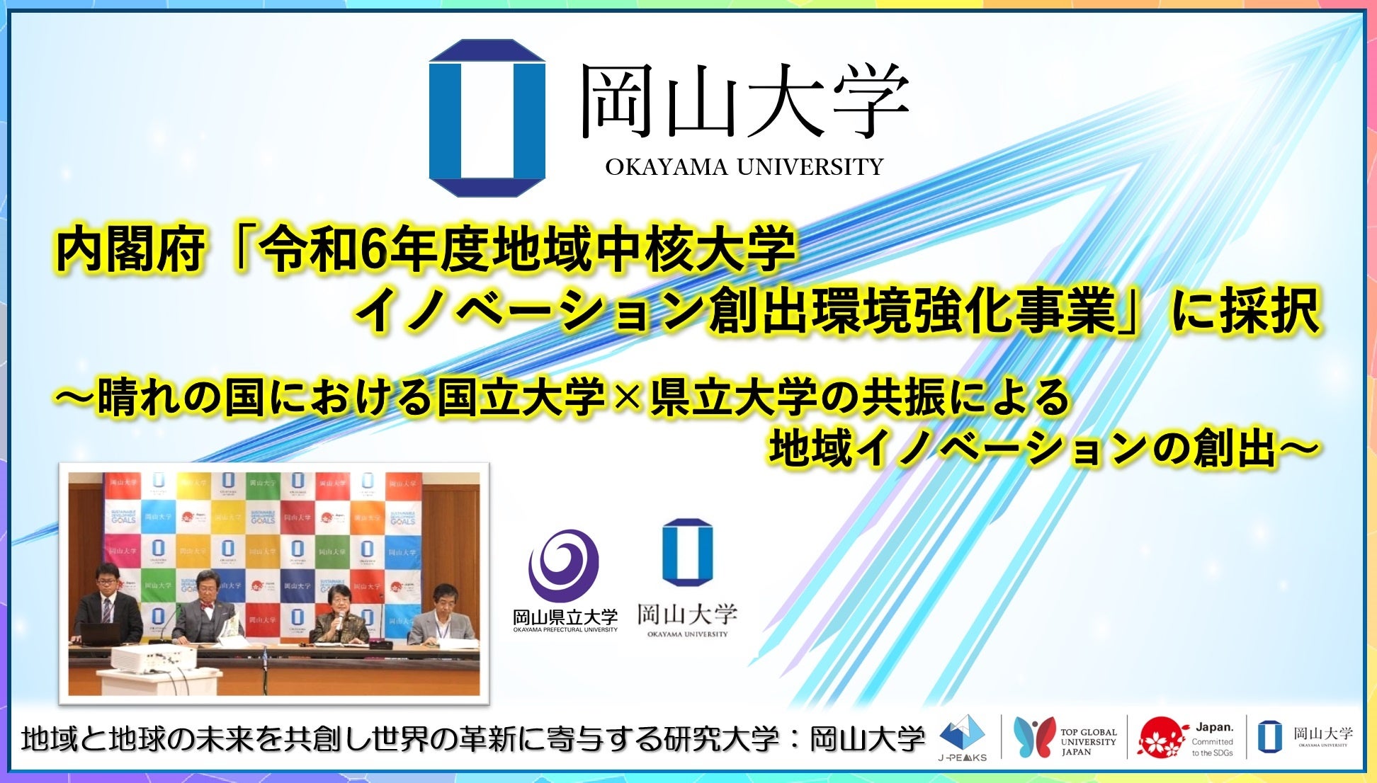 国立大学法人岡山大学(本部:岡山市北区、学長:那須保友)と岡山県立大学は2024年10月4日、内閣府「令和6年度 地域中核大学イノベーション創出環境強化事業」に採択されました。