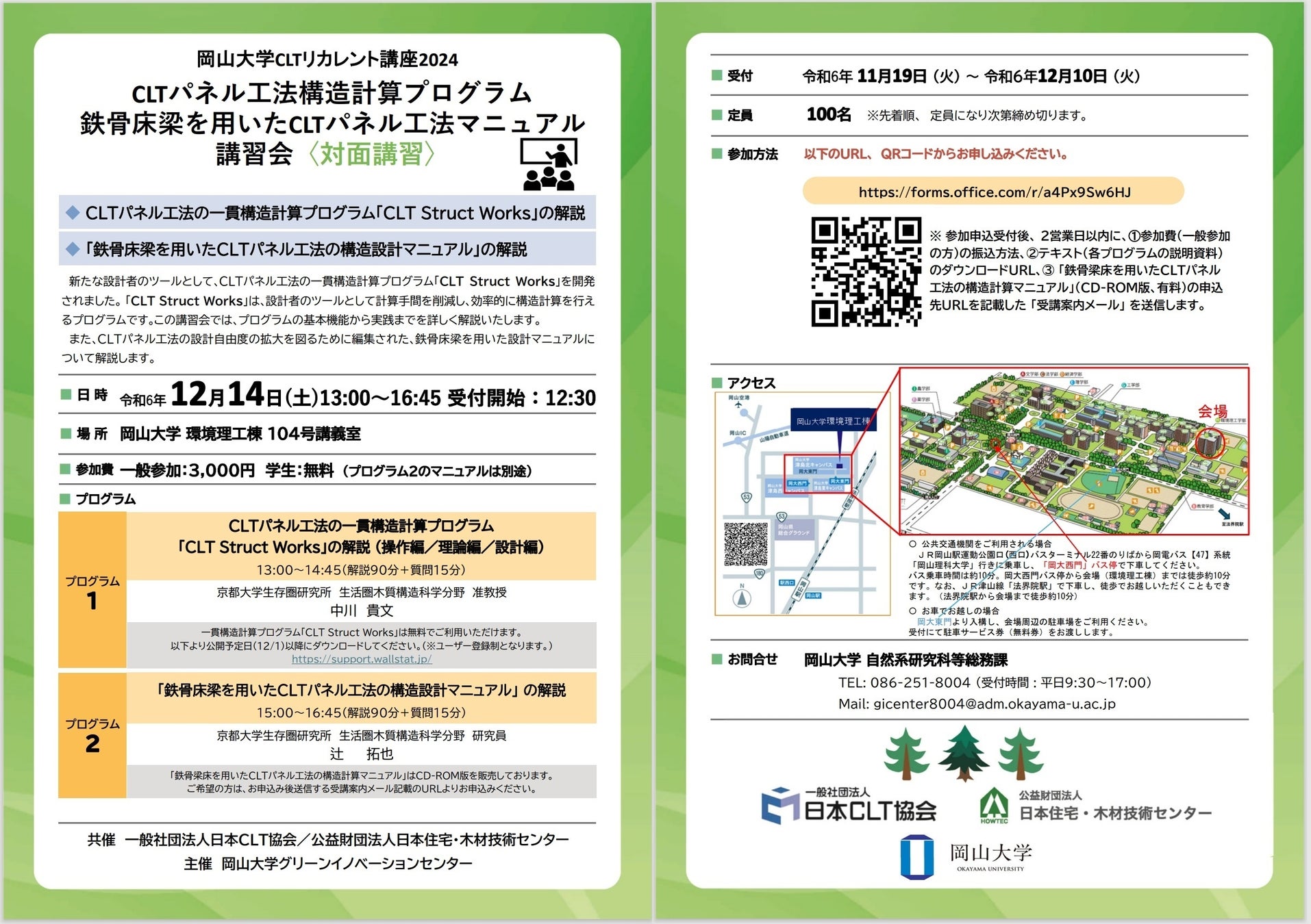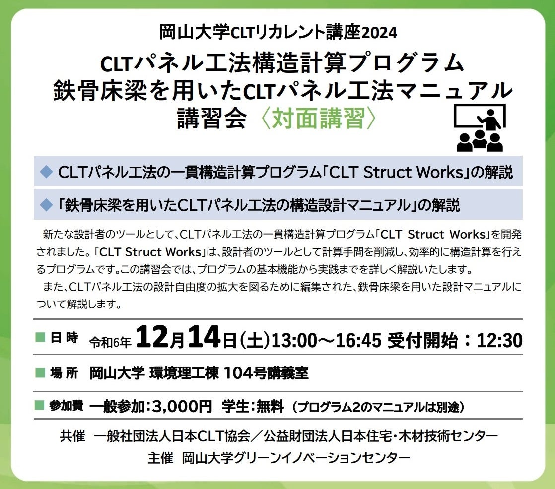 国立大学法人岡山大学(本部:岡山市北区、学長:那須保友)のグリーンイノベーションセンターでは、2022年度より毎年1回、一般社団法人日本CLT協会と共催でCLTリカレント講座を開講しています(CLT=Cross Laminated Timber)。