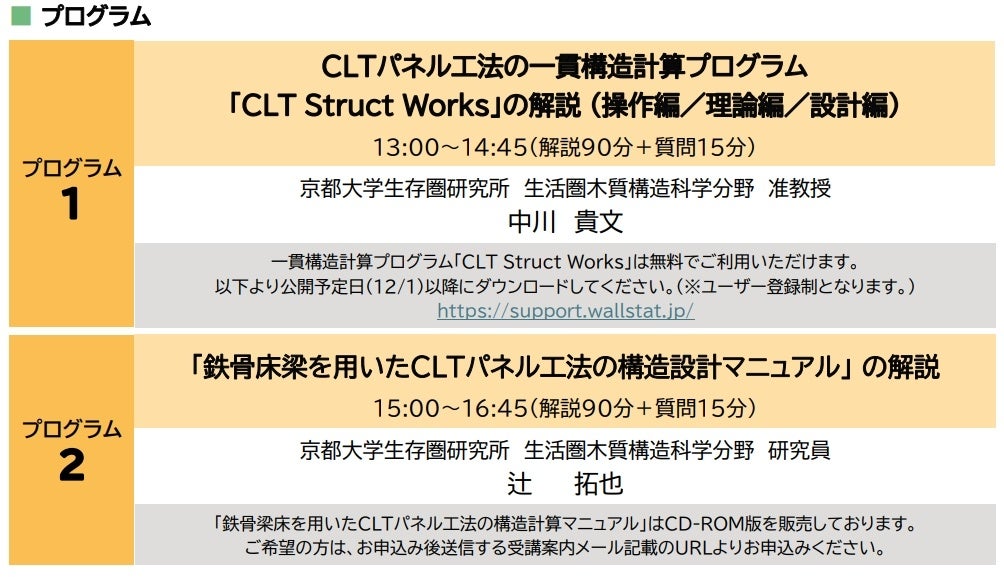 今年度は、最新のCLT に関する実務的な情報を提供するため、「鉄⾻床梁を⽤いたCLTパネル⼯法の構造設計マニュアル」及び、CLTパネル⼯法の一貫構造計算プログラム「CLT Struct Works」に関連する講習会を開催いたします。