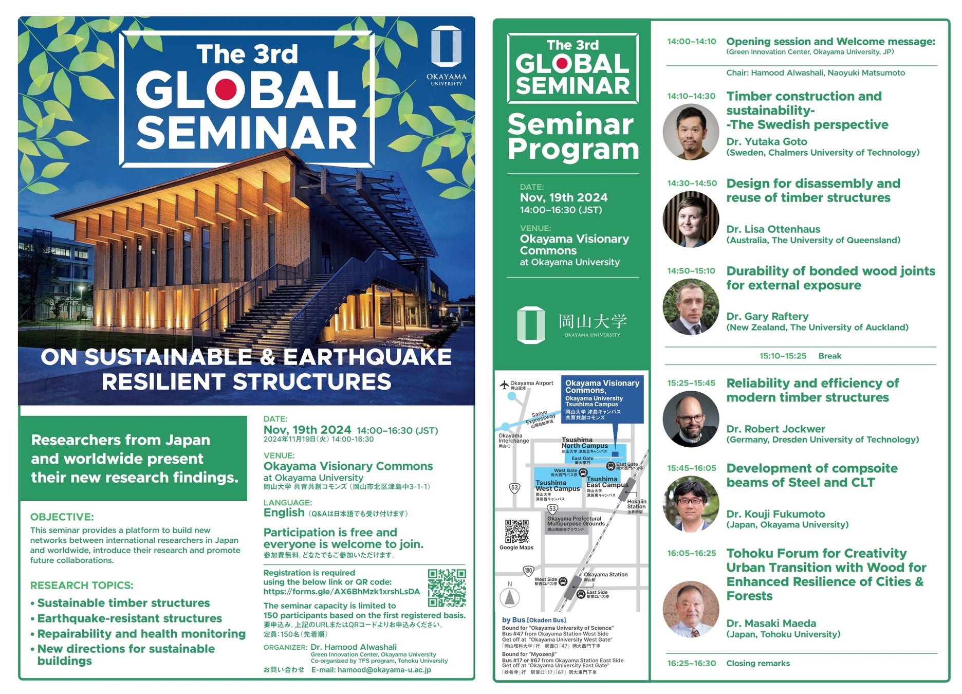 国立大学法人岡山大学(本部:岡山市北区、学長:那須保友)は、2024年11月19日(火)14:00~16:30に、今年で3回目となるグローバル・セミナーでは、持続可能な建築と木材工学の重要な研究テーマを紹介します。