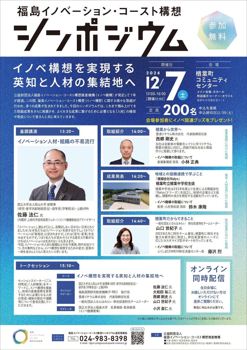 国立大学法人岡山大学(本部:岡山市北区、学長:那須保友)の佐藤法仁副理事(研究・産業共創総括担当)・副学長(学事担当)・上級URAが、2024年12月7日(土)に福島県の楢葉町コミュニティセンターで開催される公益財団法人福島イノベーション・コースト構想推進機構主催「福島イノベーション・コースト構想シンポジウム」(共催:復興庁、経済産業省、福島県)に、基調講演の演者として登壇します。