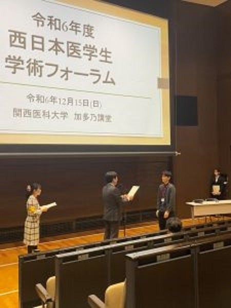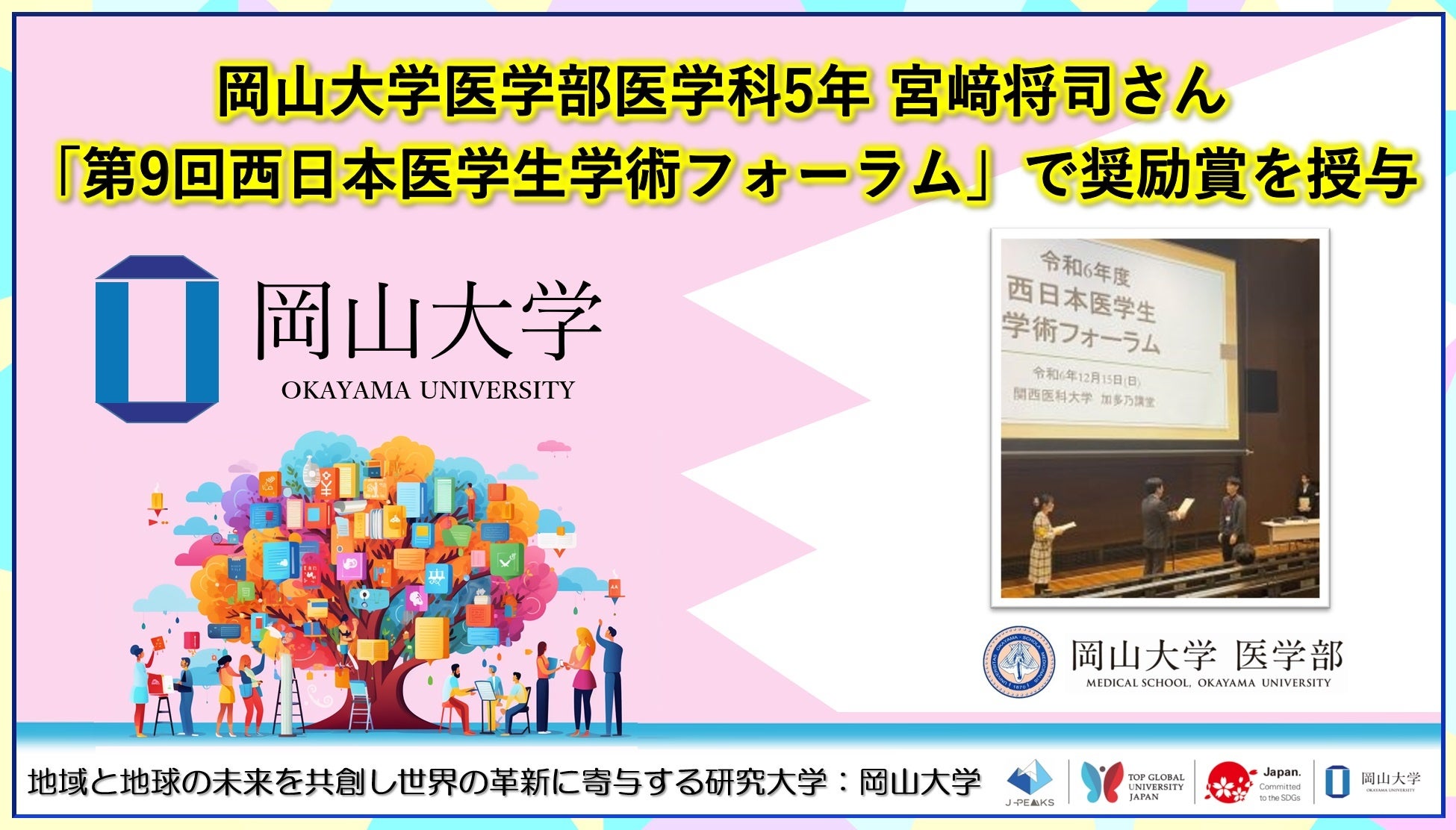 国立大学法人岡山大学(本部:岡山市北区、学長:那須保友)の医学部医学科5年の宮﨑将司さんが、2024年12月15日(日)に関西医科大学で開催された「第9回西日本医学生学術フォーラム」で奨励賞を授与されました。