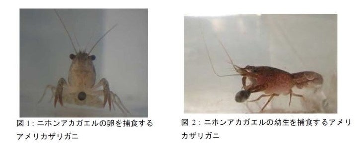 研究グループは、カエル類が減少または地域絶滅する一因について、「アメリカザリガニがカエル類の卵や幼生(オタマジャクシ)を積極的に捕食する」ことにあると予測し、複数の都府県のレッドデータブックにおいて絶滅危惧種等に選定されているニホンアカガエルを対象とし、その卵や幼生とアメリカザリガニを24時間同居させる水槽実験を実施しました。その結果、アメリカザリガニによるニホンアカガエルの卵・幼生に対する強い捕食圧が確認されました。