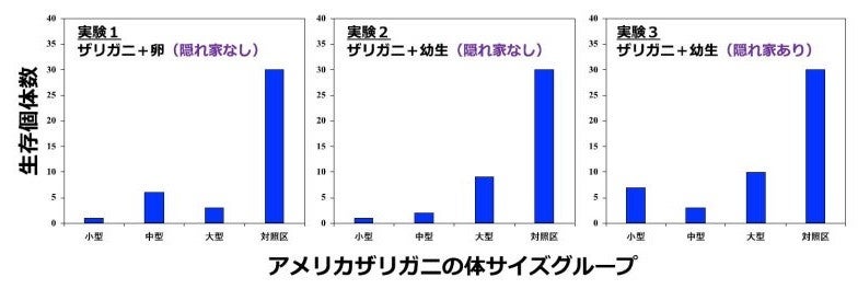 また、ニホンアカガエルにとって捕食者回避の場となる隠れ家(水草)が存在する実験条件下では、小型サイズのアメリカザリガニに対しては幼生の生存率が統計学的に有意に増加する効果が認められたものの、中型・大型サイズのアメリカザリガニと同居させた実験では、隠れ家なしの条件下と比べて幼生の生存率は有意に異なりませんでした。
