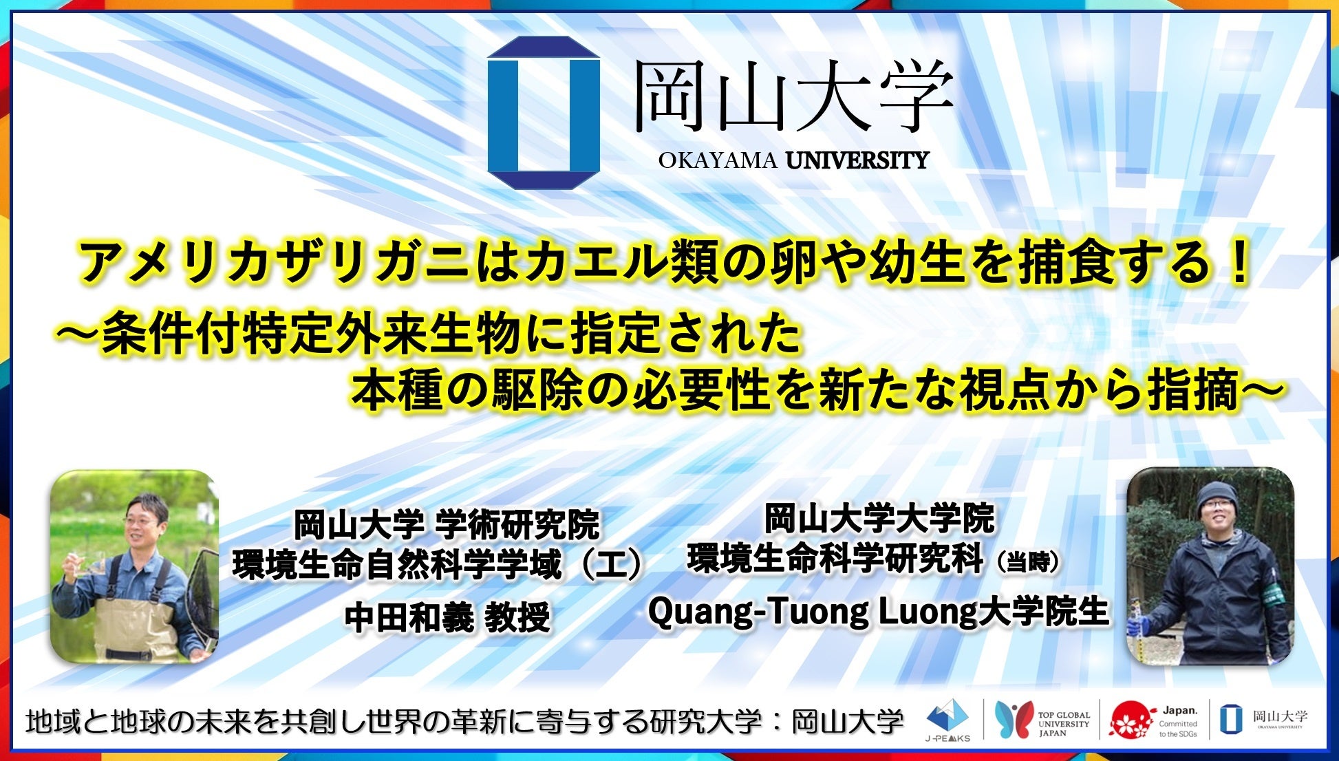 国立大学法人岡山大学(本部:岡山市北区、学長:那須保友)大学院環境生命科学研究科のQuang-Tuong Luong大学院生(当時。現ベトナムNguyen Tat Thanh大学 講師)、学術研究院環境生命自然科学学域(工)の中田和義教授(保全生態学)と勝原光希助教(植物生態学)の研究グループは、アメリカザリガニによるニホンアカガエルに対する捕食に関する新知見を明らかにしました。