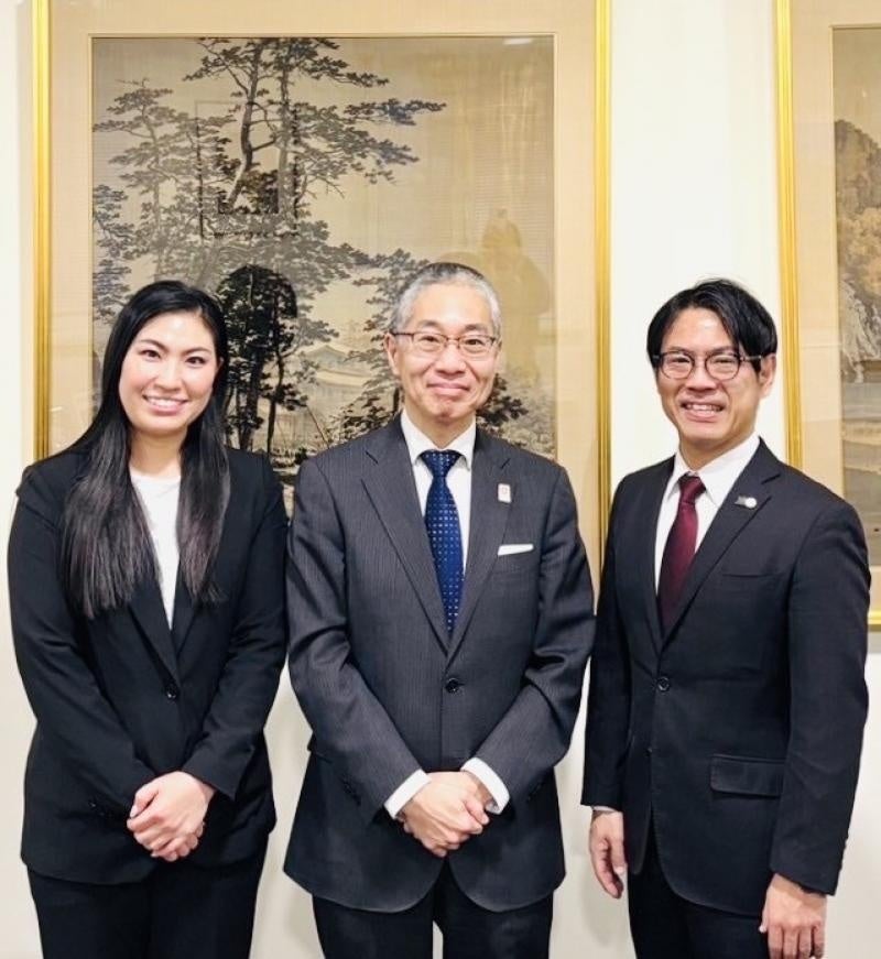 また、会議前日の11日には、横井副学長は在ハンブルク日本国総領事館を訪問。戸田信介総領事と会談しました。戸田総領事からはハンブルクの大学・地域を含めた日本との交流実績についての説明があり、横井副学長は、今回の訪問目的と本学の海外戦略の説明に加え、ハンブルクが岡山と同じようにESDの世界的な地域拠点として推進してきたこと、ハンブルク特別市の行政、企業、教育機関、非営利団体の代表が参加するネットワーク組織が2022年に「ESD岡山アワード」を受賞したことなどを紹介しました。