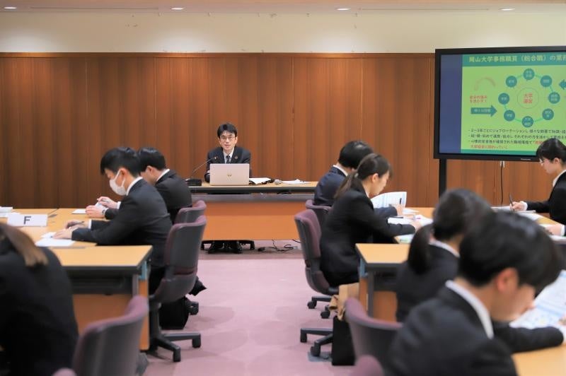 開会にあたり、総務・企画部人事課の小川義弘総括主査が岡山大学の概要と職員採用試験について説明。参加者は、岡山大学の事務職員の業務やキャリアパス、独自採用試験などについて、興味深く耳を傾けていました。