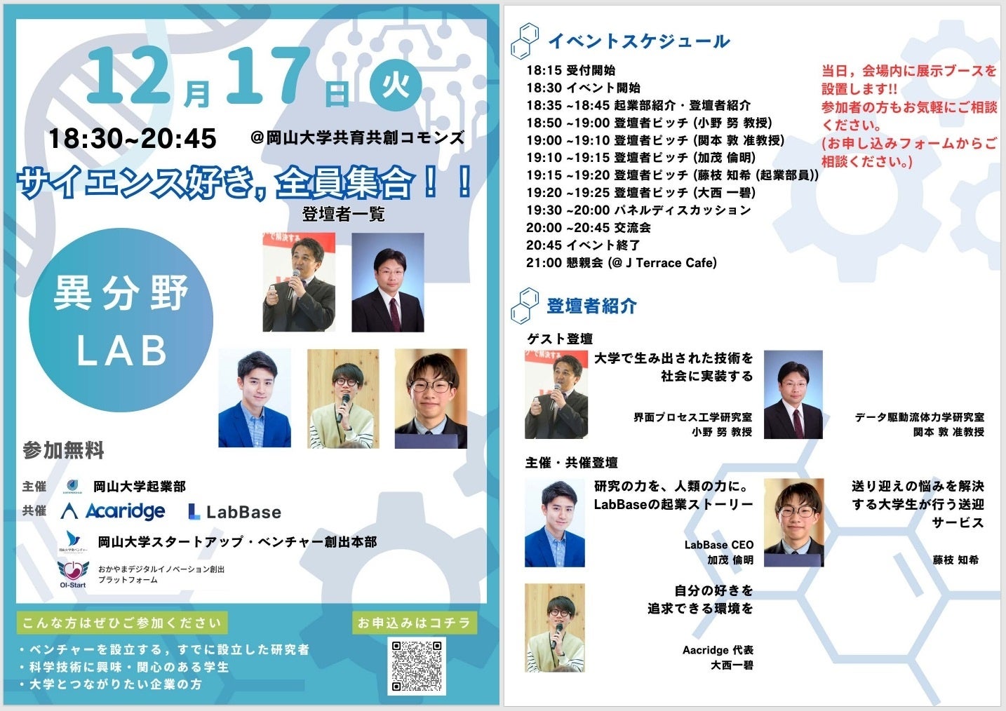 このイベントは岡山大学起業部が主催し、株式会社LabBase、Acaridge、おかやまデジタルイノベーション創出プラットフォーム(OI-Start)、岡山大学スタートアップ・ベンチャー創出本部が共催しました。