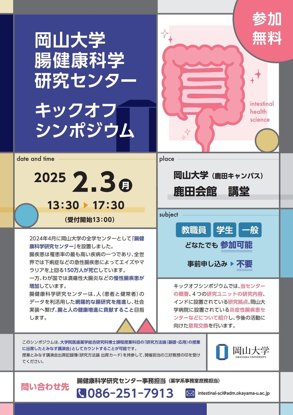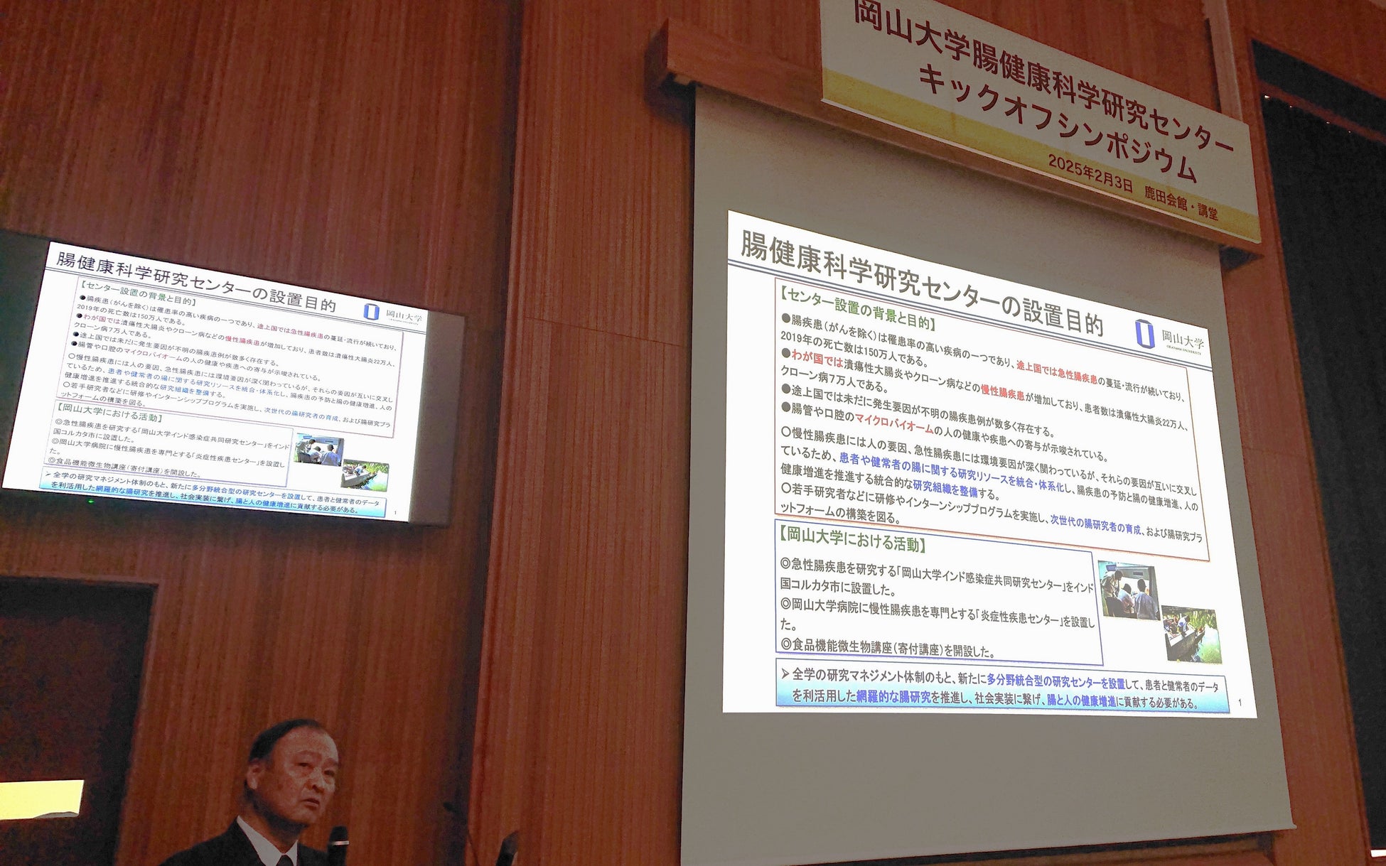 国立大学法人岡山大学(本部:岡山市北区、学長:那須保友)は、2024年4月に全学センターとして設置された「岡山大学腸健康科学研究センター」のキックオフシンポジウムを、本学津島キャンパスの鹿田会館講堂において2025年2月3日、開催し、約60人が参加しました。