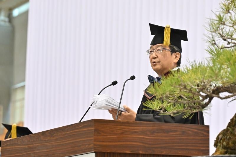 那須保友学長は式辞で、「岡大愛(岡大ラブ)」「不易流行」をキーワードとして紹介し、「現代社会の課題の多くは、極めて複雑に絡み合っており、『不易』を見定める必要があります。そのような時に求められることは、『未来のあるべき姿』を思い浮かべ、そこに近づくために、いま何が必要かを自分事(ごと)として深く考え、自ら行動することです」と話すとともに、「今日から岡山大学の学生として、『希望』に溢れた新しい一日が始まります。どうか自分を信じ、主体性をもって、とにかく一歩を踏み出してください。私たちは、皆さんとともに築いていくこれからの未来が、これまでの本学の歴史や伝統を超えるものとなり、皆さんにより大きな『誇りと希望』をもたらすことを心から期待しています」と式辞を述べました。