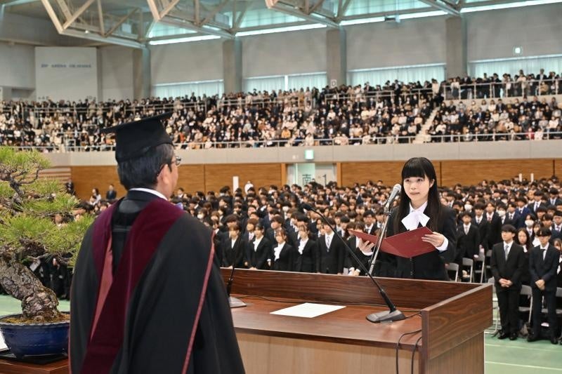 入学生を代表し、文学部の伊藤優花さんが「私たちは変化に流されることなく、自分の夢や目標に向かって、主体的に何事にも挑戦していく決意を抱いています。私たち新入生は、歴史と伝統ある岡山大学において、目の前の課題に真摯な姿勢で取り組み、社会に貢献できる人間となるべく、勉学に励み、学生生活が実りあるものとなるよう努力することを誓います」と宣誓し、これから始まる大学生活に向けて決意を新たにしました。