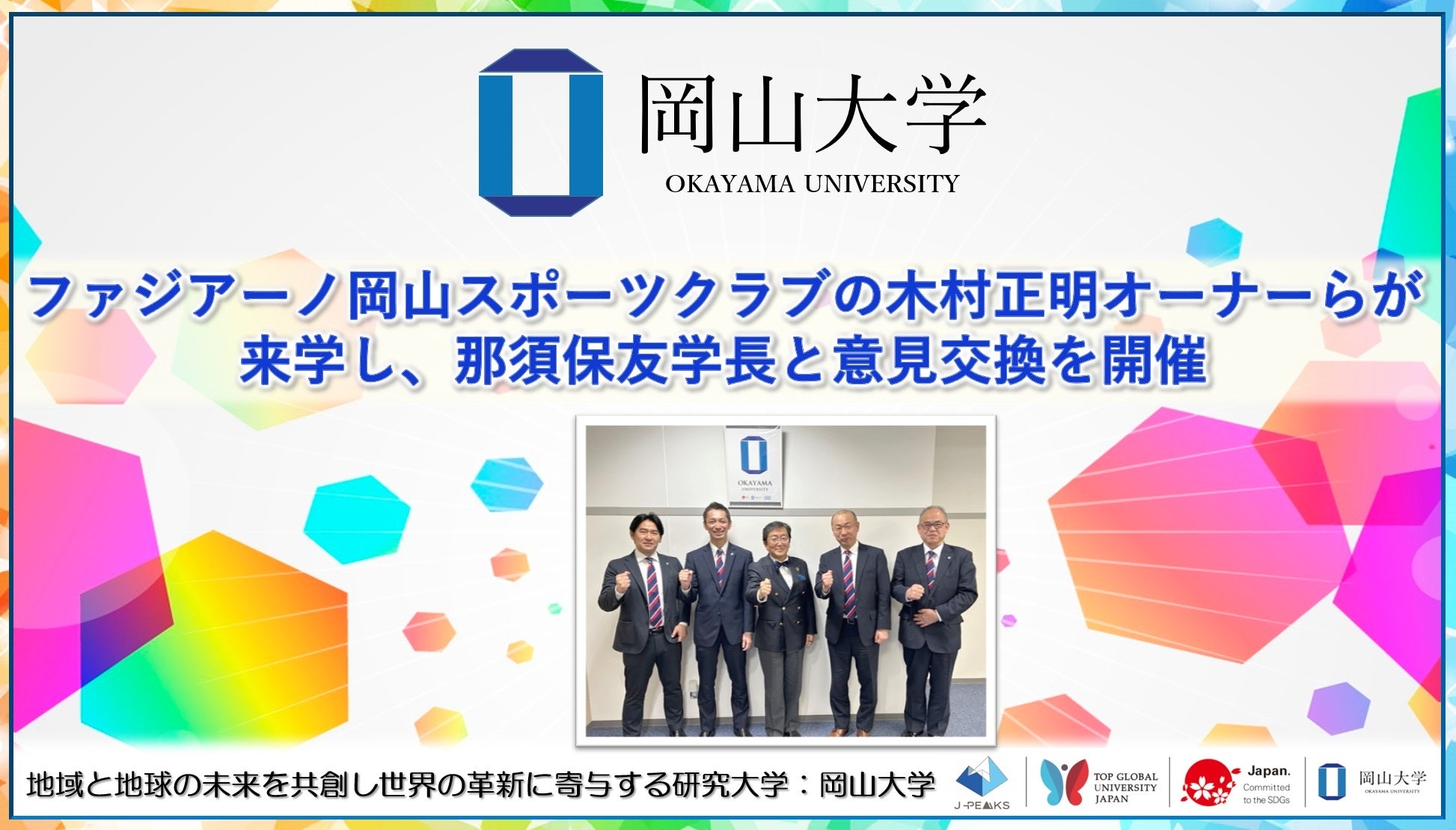 国立大学法人岡山大学(本部:岡山市北区、学長:那須保友)は、2025年3月19日、株式会社ファジアーノ岡山スポーツクラブの木村正明オーナー、北川真也代表取締役会長、森井悠代表取締役社長、増井哲哉ディレクターが本学を訪れ、那須保友学長と意見交換を行いました。