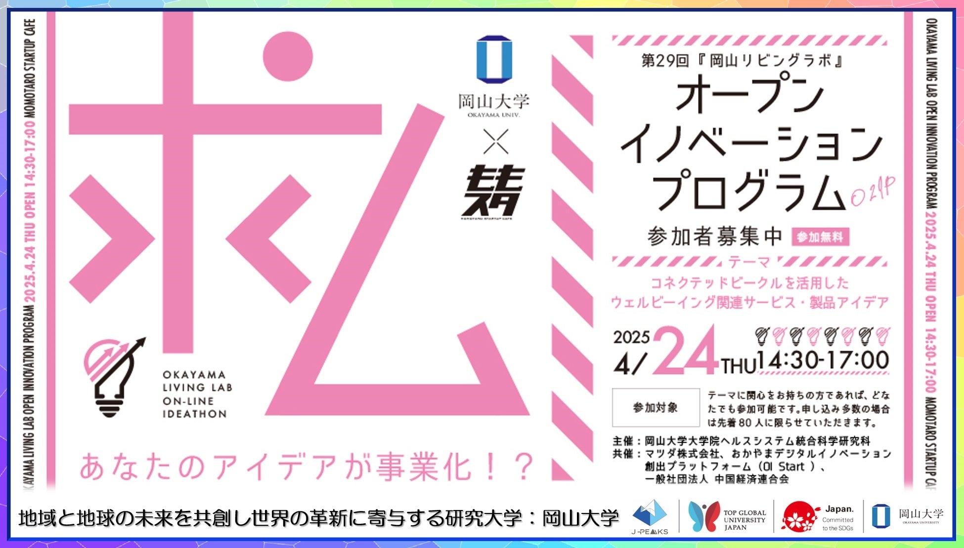 ・【岡山大学】第14回「岡山リビングラボ」オープンイノベーションプログラム「自治体のヘルスケア・アプリの高付加価値化や地域での普及につながるアイデア」を開催しました
