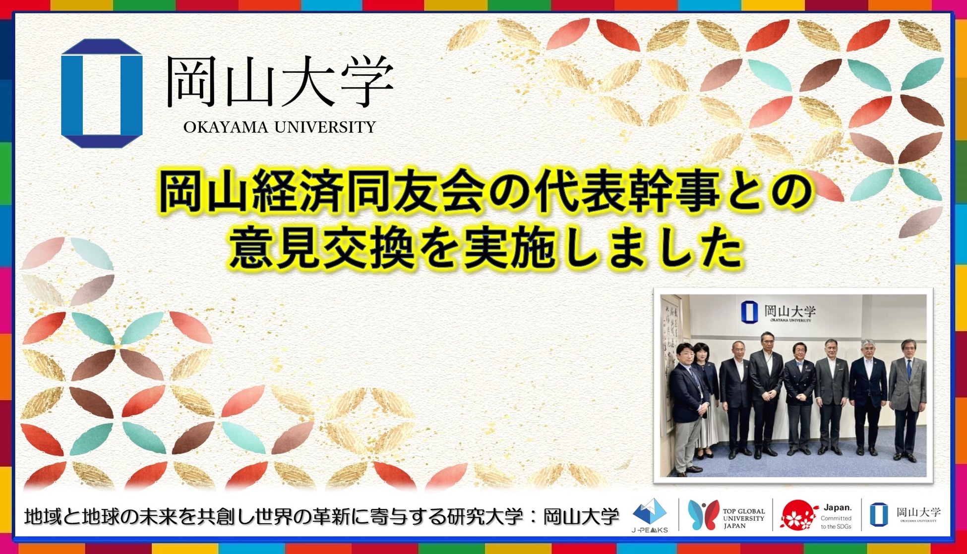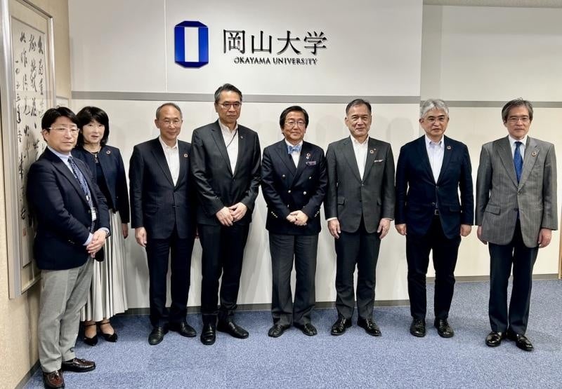 国立大学法人岡山大学(本部:岡山市北区、学長:那須保友)は2025年6月4日、一般社団法人岡山経済同友会の梶谷俊介顧問(前代表幹事・岡山トヨタ自動車株式会社代表取締役社長)、中島義雄代表幹事(帝人ナカシマメディカル株式会社取締役会長)、加藤貞則代表幹事(株式会社中国銀行代表取締役頭取)が本学を訪れ、那須保友学長、三村由香里理事(企画・評価・総務担当)、菅誠治理事(教学担当)、小代哲也理事(財務・施設担当)および阿部匡伸理事(DX・GX担当)と意見交換を行いました。
